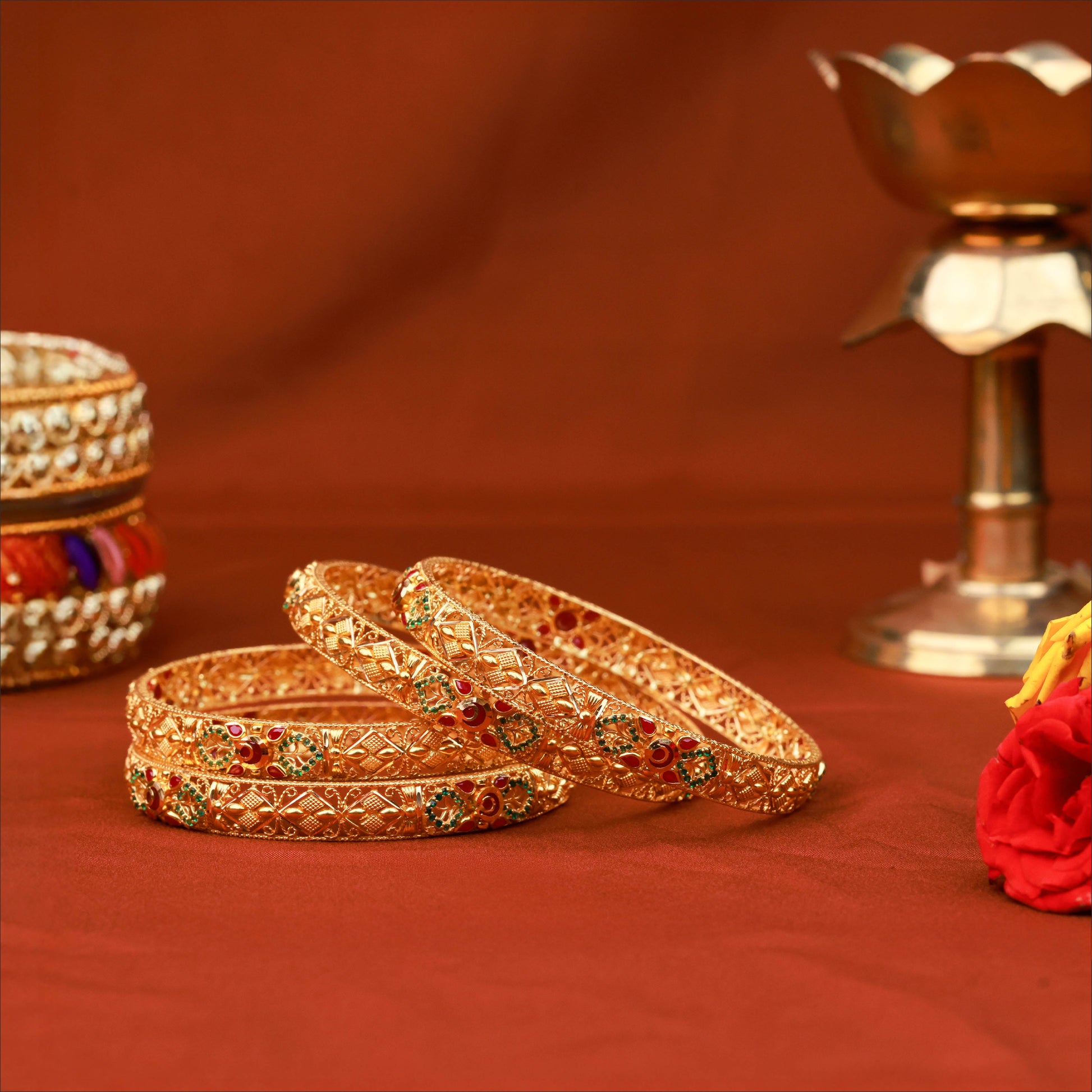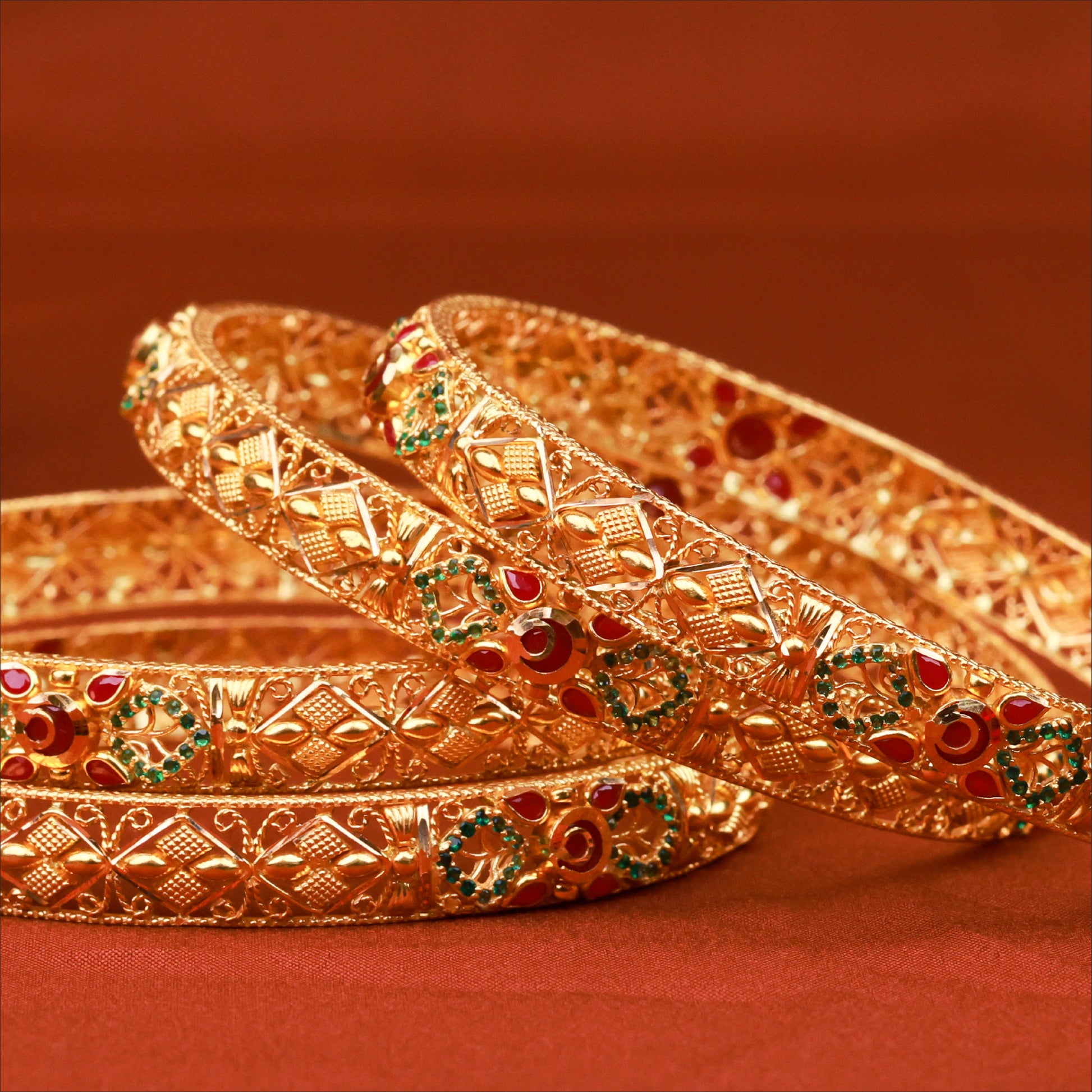 Sparkle with modern brilliance. This 22KT gold fancy bangle, perfect for a wedding set, features a delicate floral design studded with glittering CZ stones. It's the ideal choice for a bride who loves the contemporary glamour of gold bangles with white stones.