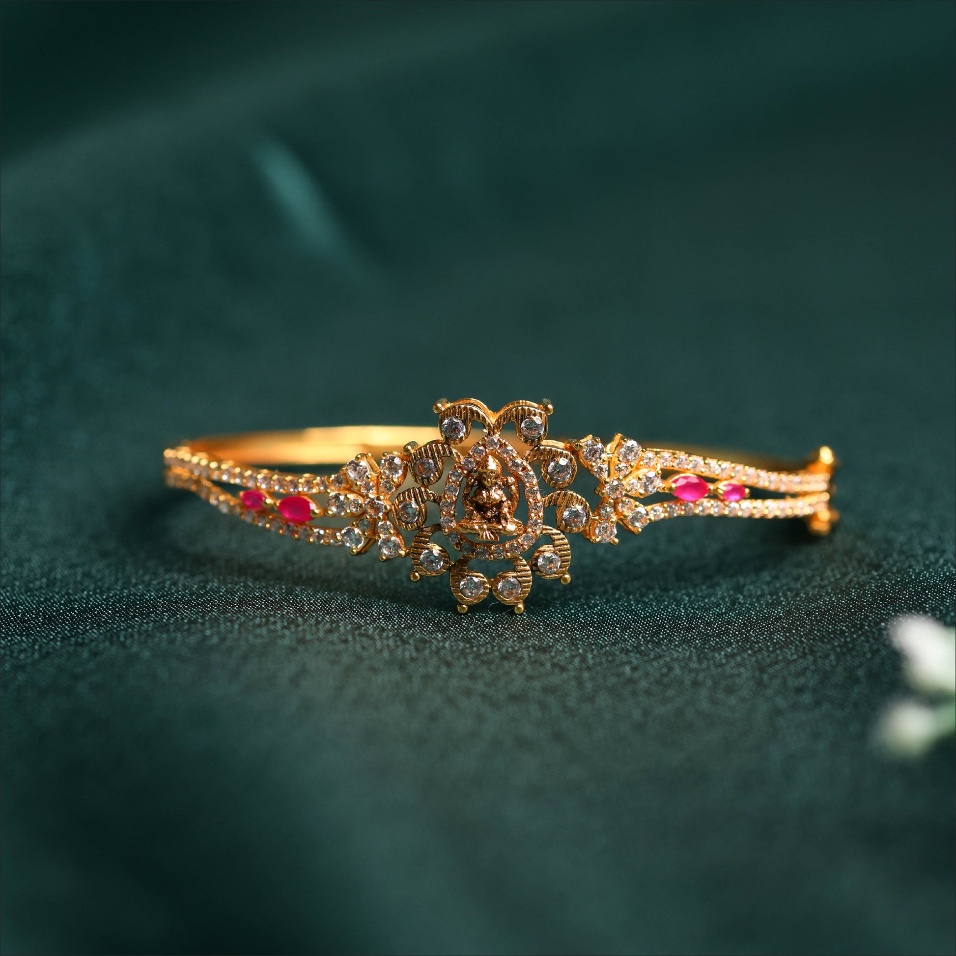 Define your style with this masculine Red And White Stones Antique Lakshmi Traditional Kada. Crafted in high-quality 22KT Gold, this piece is a standout in our Men's Kada Collection. Perfect for weddings and festive occasions