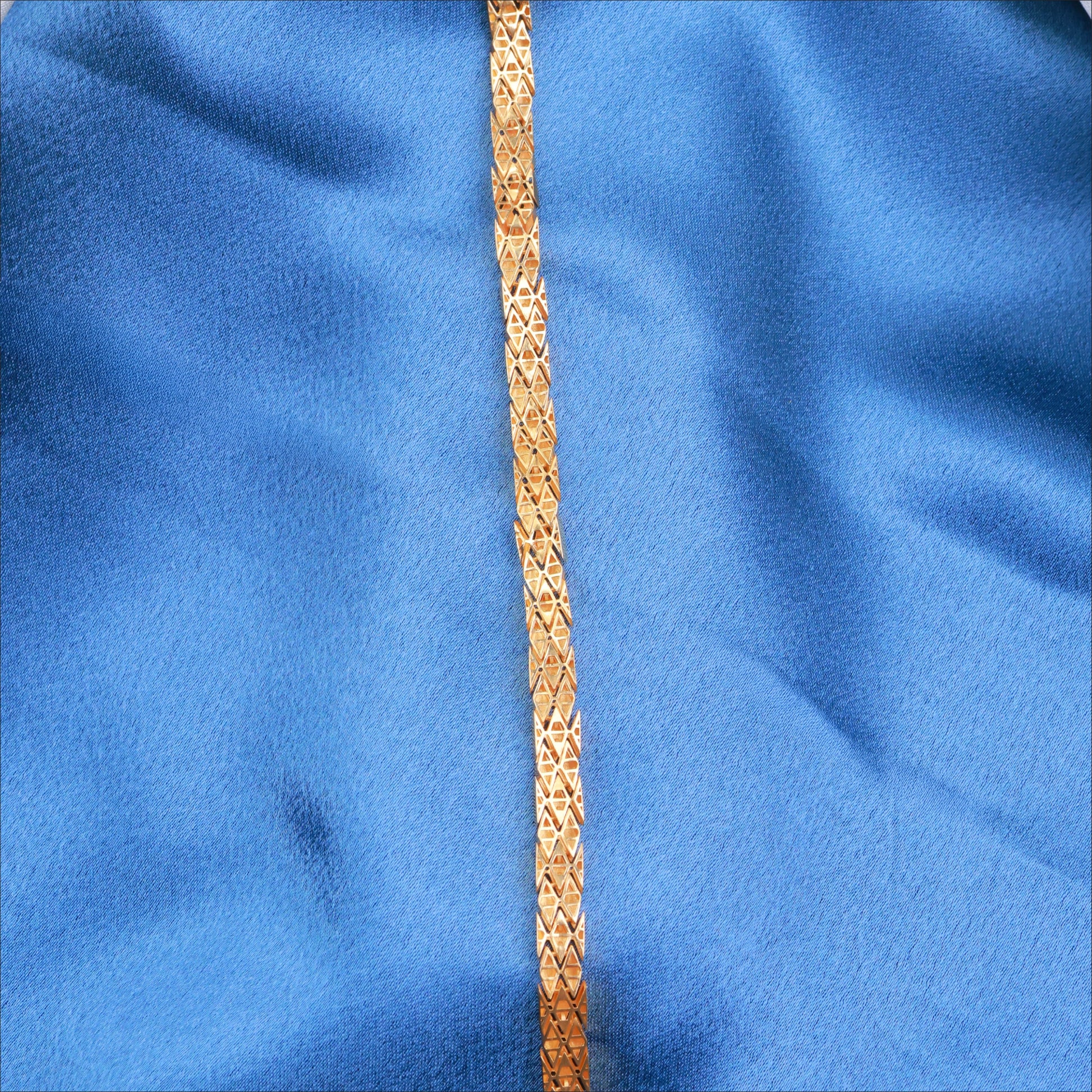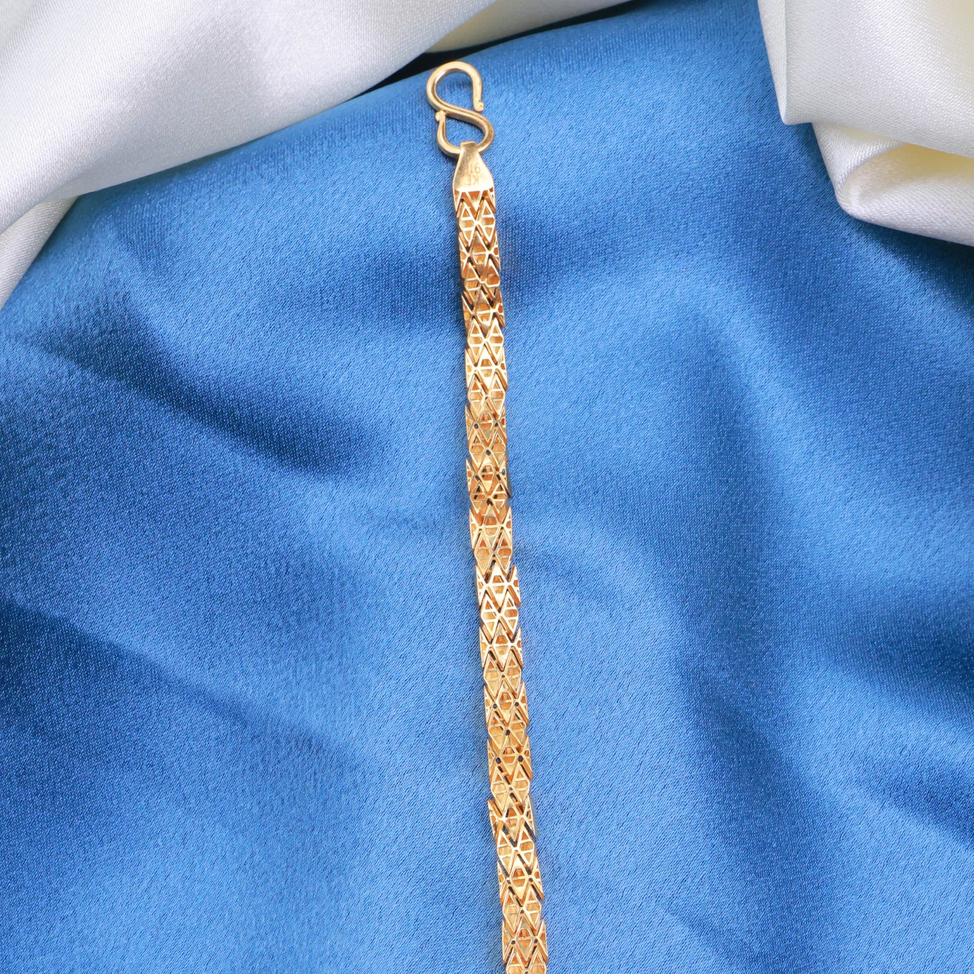 Refine your accessory collection with this striking 22KT gold fancy bracelet. The design is built around a precisely engineered diamond-shape casting model, with facets that catch the light beautifully from every angle. This creates a sharp, masculine elegance that is both noticeable and sophisticated. It’s a testament to fine craftsmanship, rendered in the pure, warm glow of 22KT gold.