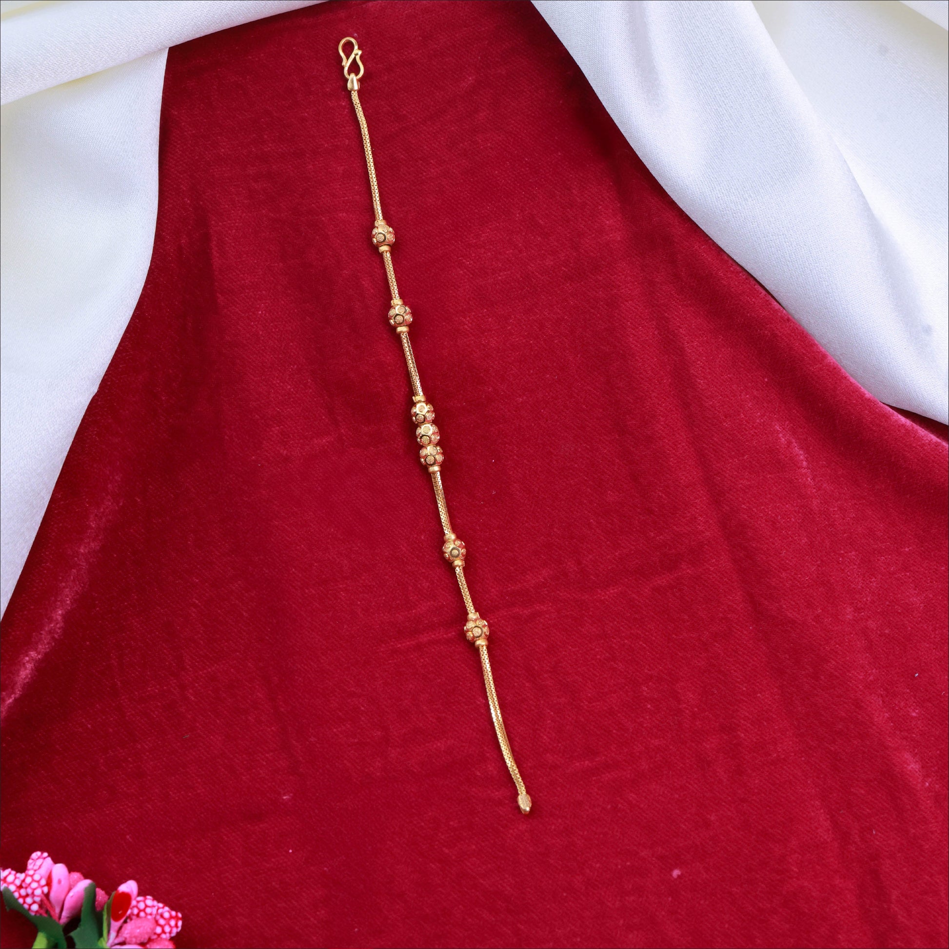 Discover modern chic with this playful and contemporary 22KT gold women's bracelet. This fancy bracelet is fashion-forward, adorned with alternating, polished gold and brilliant rhodium-finished balls. This two-tone effect creates a versatile, eye-catching look that's perfect for stacking or wearing alone. It's a light, fashionable accessory that adds a touch of modern sophistication to any outfit, from casual to formal.