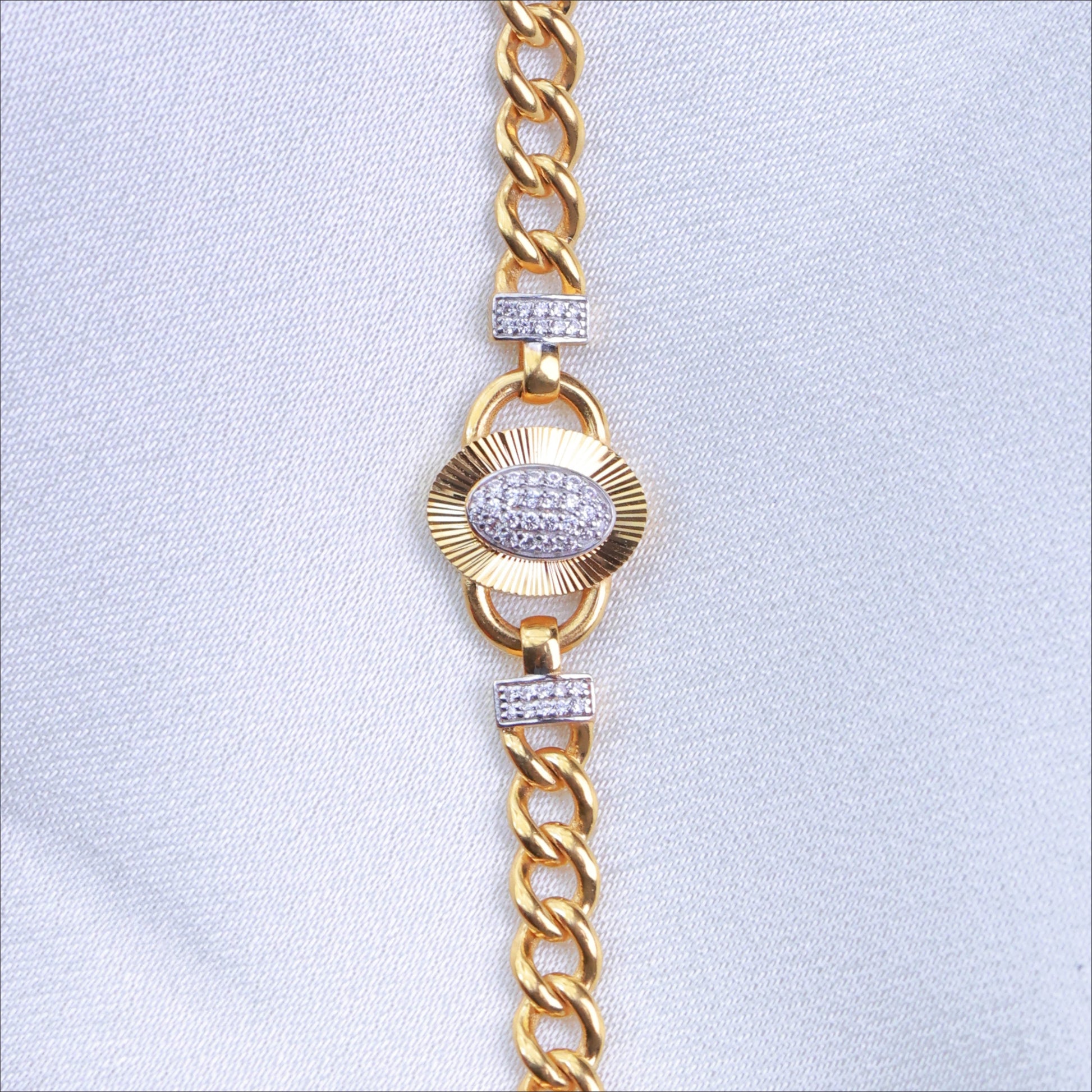 Discover sophistication in its most elegant form. This 22KT gold women's bracelet features a sleek, refined chain model casting design that drapes beautifully on the wrist. The design is perfectly centered with a single, brilliant white stone, which acts as a sophisticated focal point. This fancy bracelet is the epitome of in-demand, classic glamour, offering a timeless look that's perfect for any occasion.