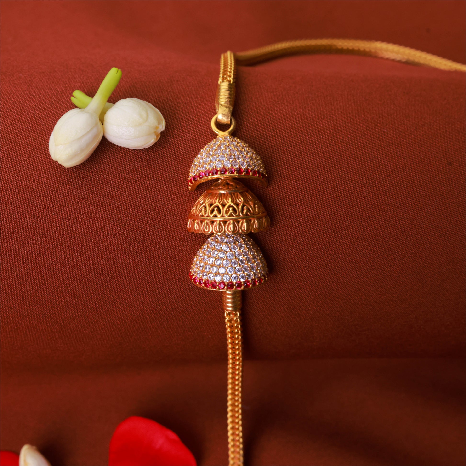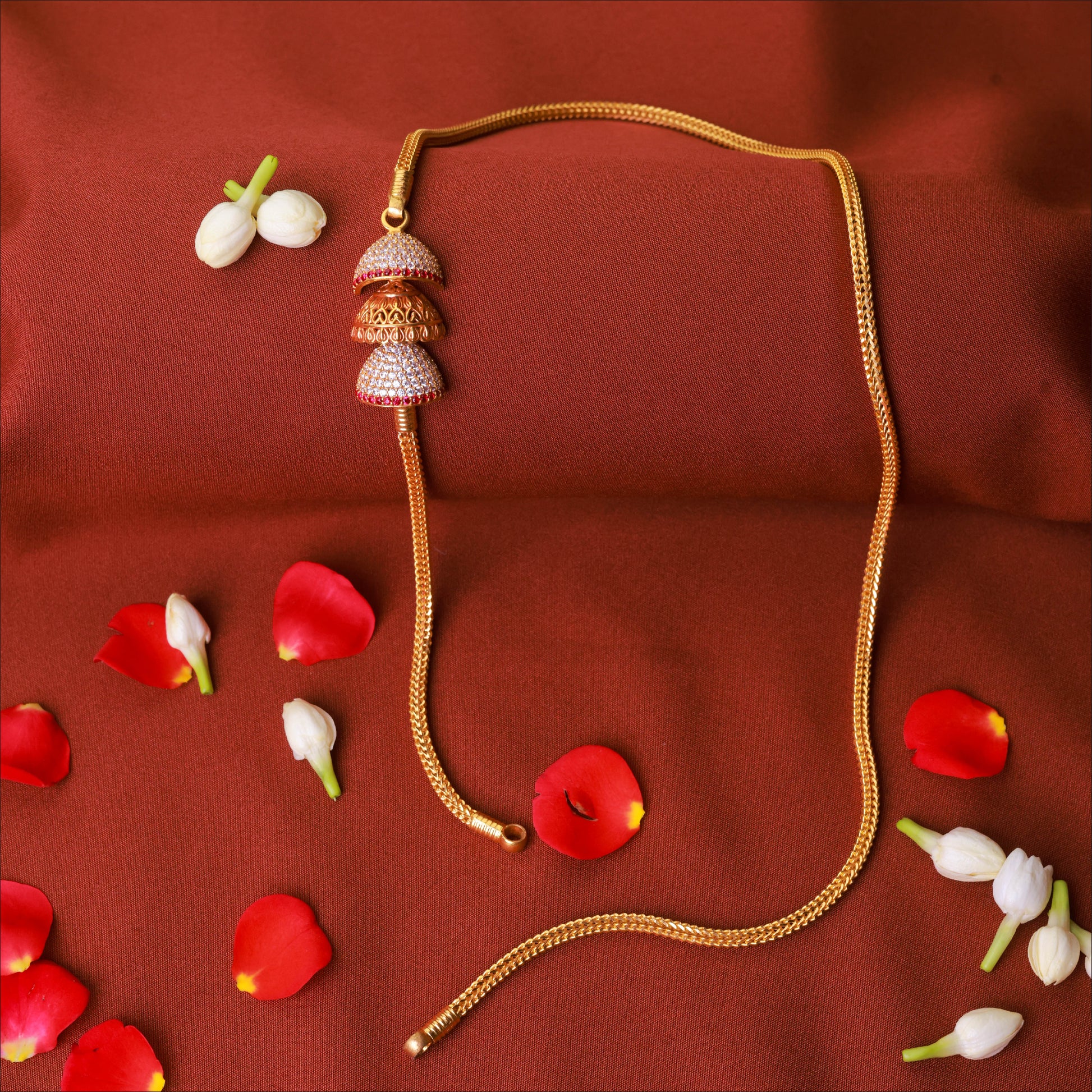 Adorn yourself with this auspicious Half Jhumka Stone Plain Mugappu Chain. Crafted in high-quality 22KT Gold, this piece is a standout in our Mugappu Collection. Perfect for weddings and festive occasions.