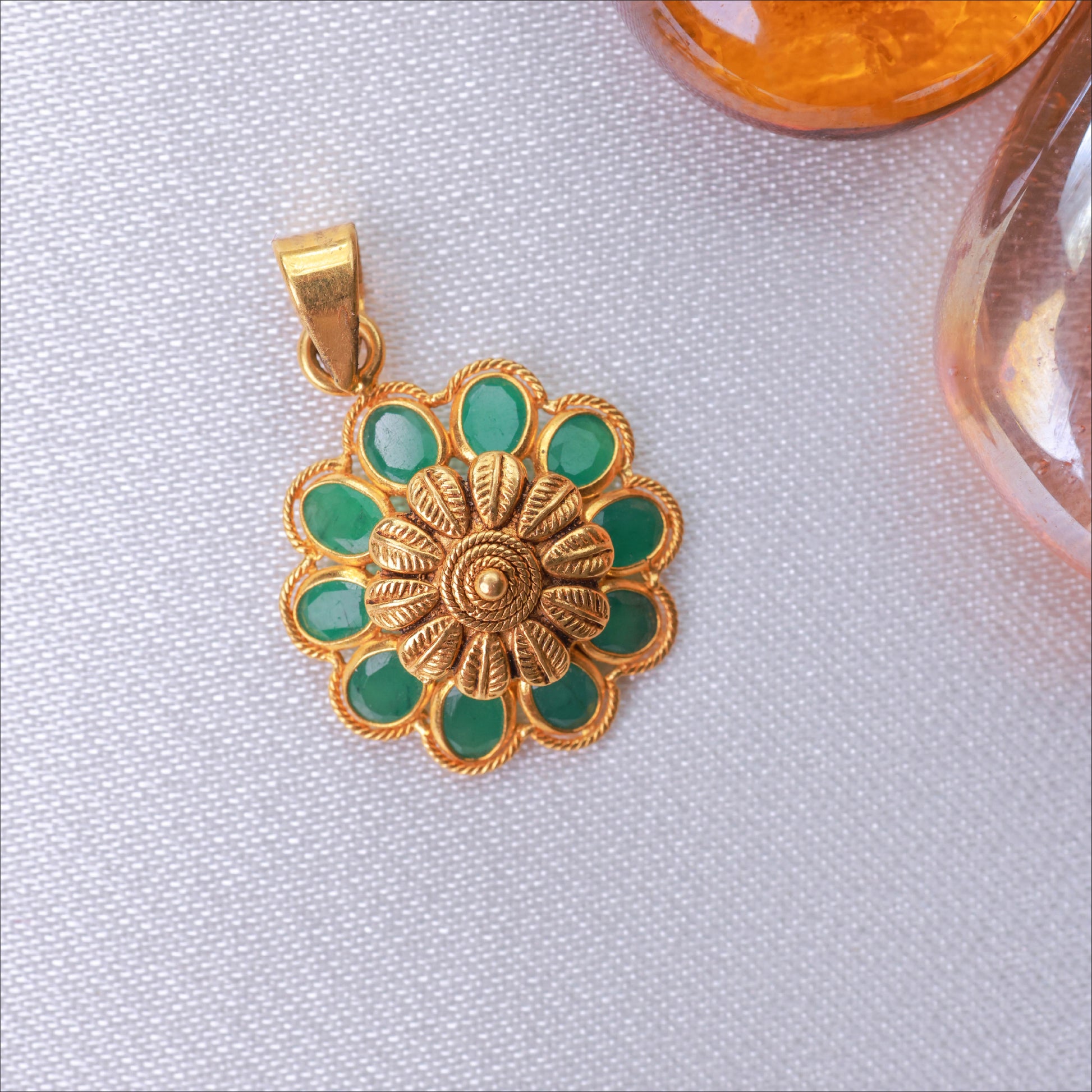 Make a bold statement with this bold Green Stone With Antique Flower Pattern Pendant. Crafted in high-quality 22KT Gold, this piece is a standout in our Men's Pendant Collection. Perfect for weddings and festive occasions.