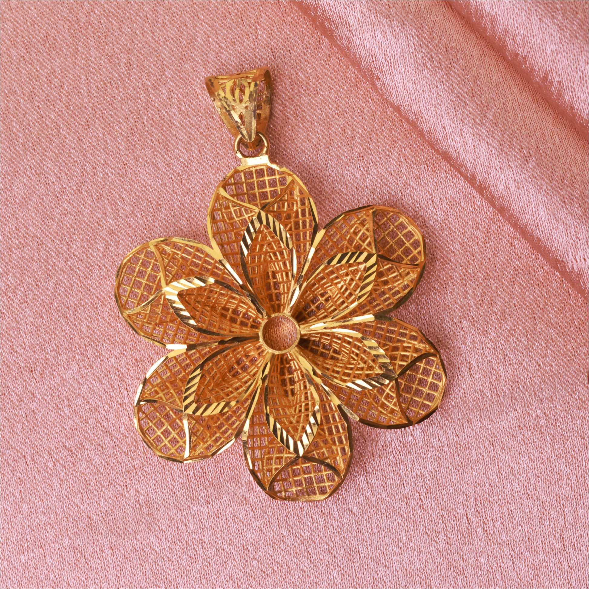 Embrace exotic elegance with this 22KT gold Turkey pendant. Inspired by intricate Ottoman art, this piece features a stunning, symmetrical floral design, meticulously crafted for a look of sophisticated, worldly charm. A perfect designer floral pendant for the woman who loves unique treasures.
