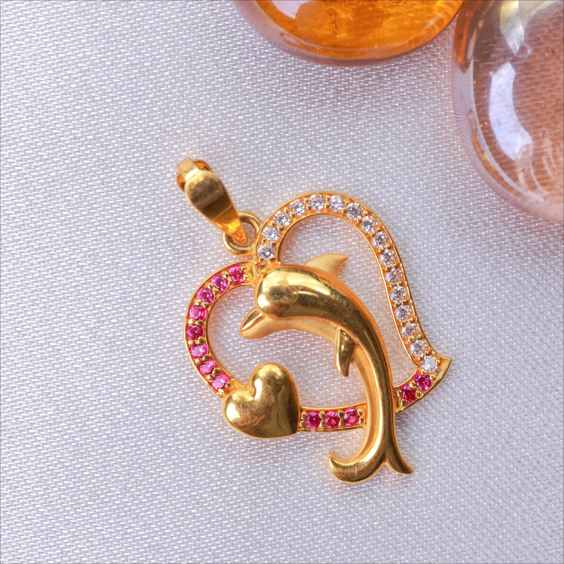Elevate your look with this artistic Heart With Dolphin Full Stone Work With Casting Pendant. Crafted in high-quality 22KT Gold, this piece is a standout in our Casting Collection. Perfect for weddings and festive occasions.