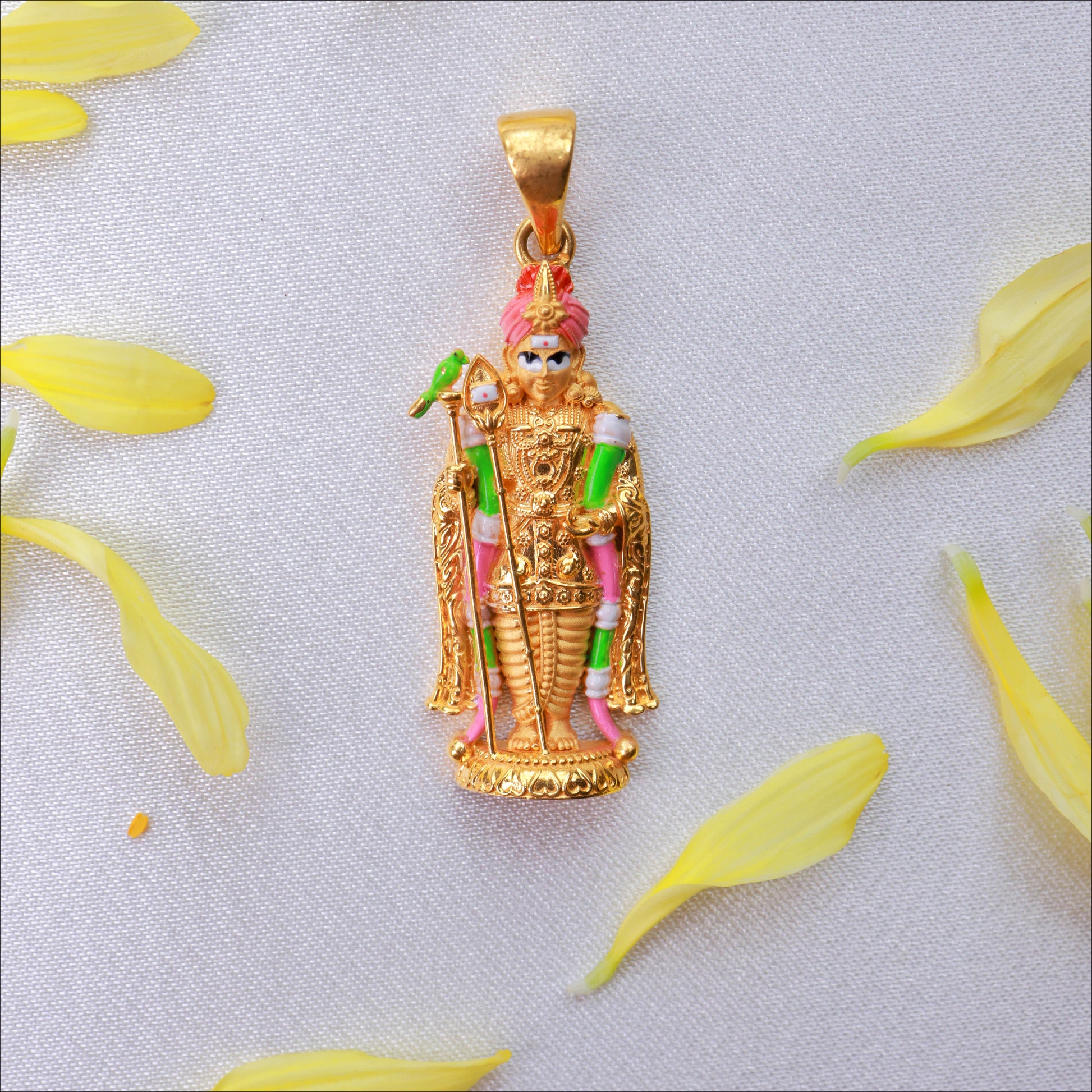 Invoke blessings with this divine Traditional Look Fancy Murugan Pendant. Crafted in high-quality 22KT Gold, this piece is a standout in our Temple Jewellery Collection. Perfect for weddings and festive occasions.