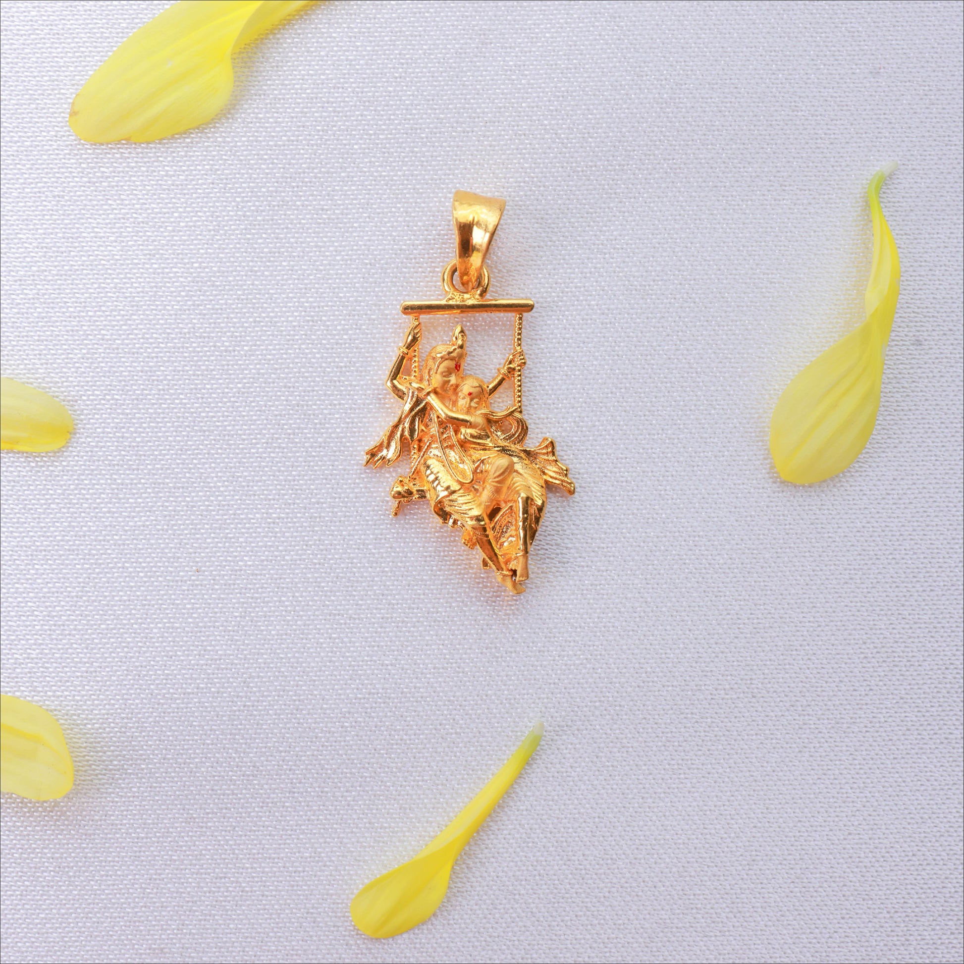 Invoke blessings with this intricate Casting Double Shaded Radhai Krishna Pendant. Crafted in high-quality 22KT Gold, this piece is a standout in our Temple Jewellery Collection. Perfect for weddings and festive occasions.