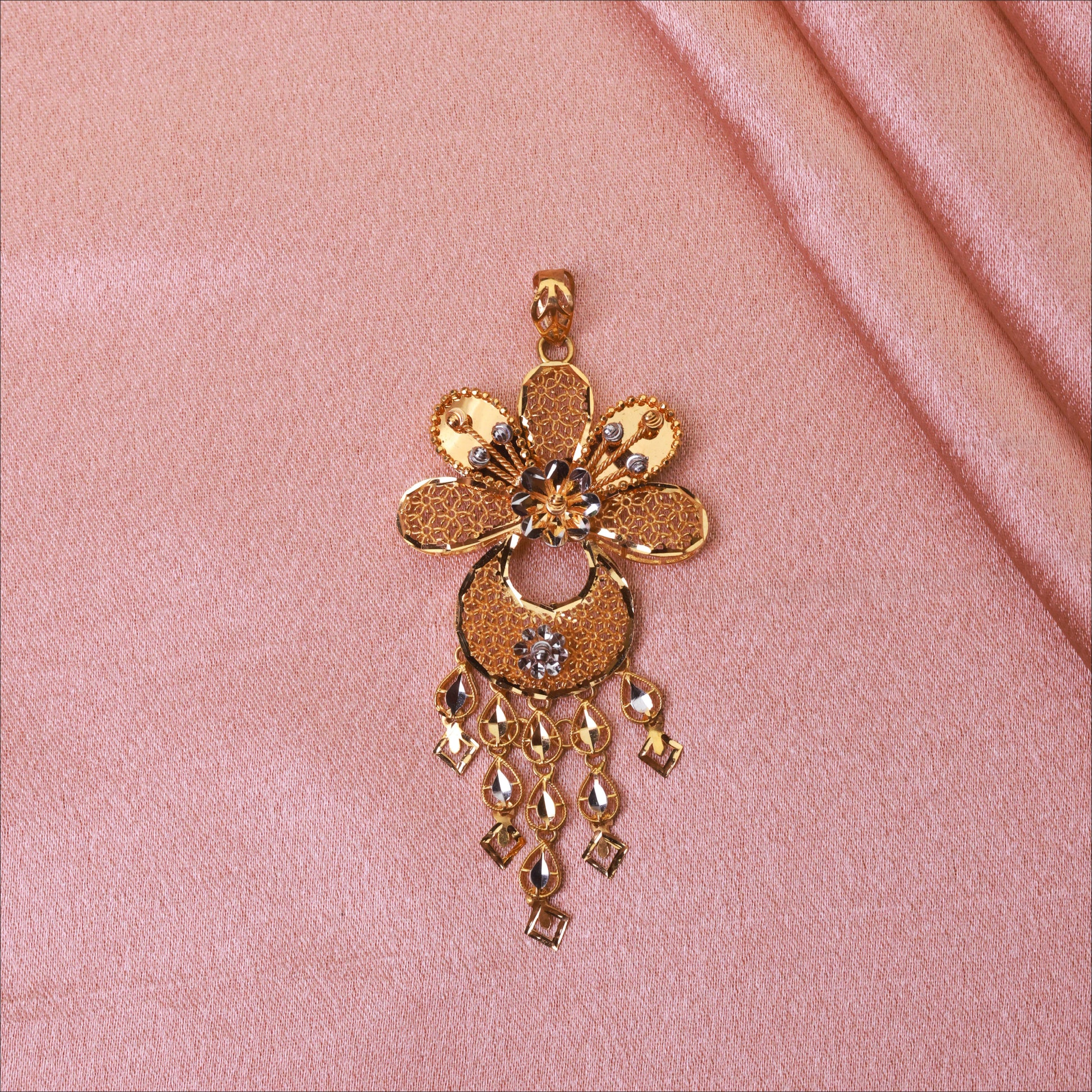 Make a bold statement with this masculine White Rodium With Turkey Finishing Flower Pattern Fancy Pendant. Crafted in high-quality 22KT Gold, this piece is a standout in our Men's Pendant Collection. Perfect for weddings and festive occasions.