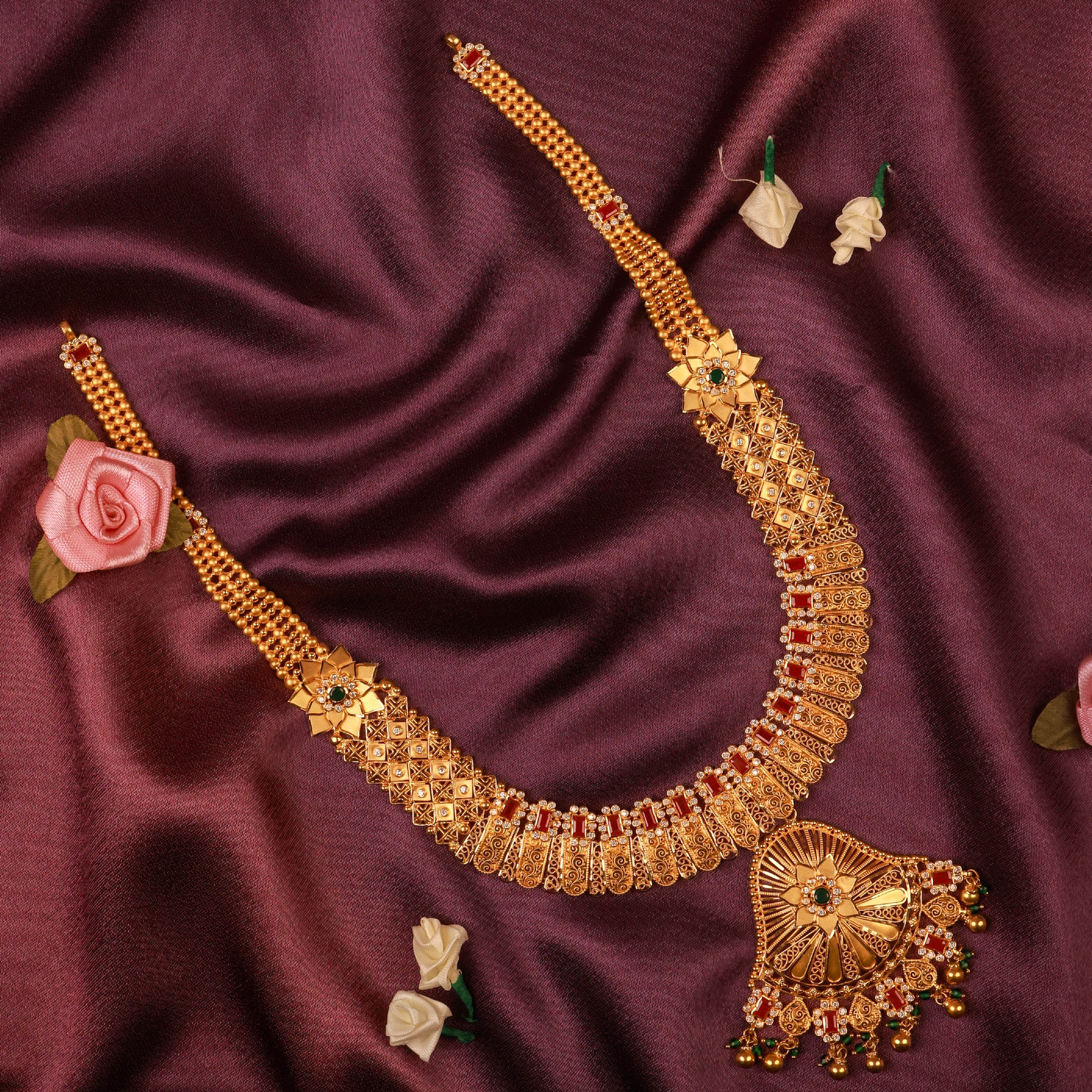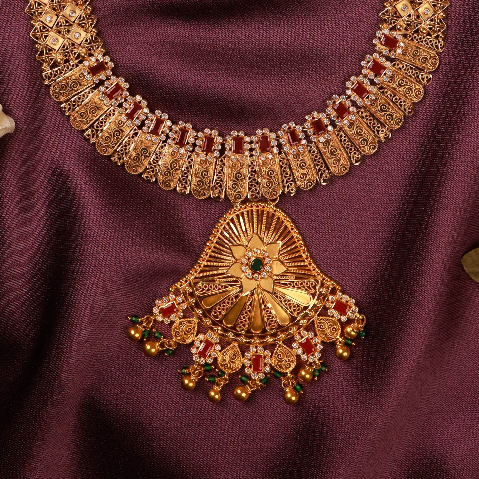 Discover the elegance of this colorful Mukthi Haram. Crafted in high-quality 22KT Gold, this piece is a highlight of our Stone collection. Perfect for weddings and festive occasions