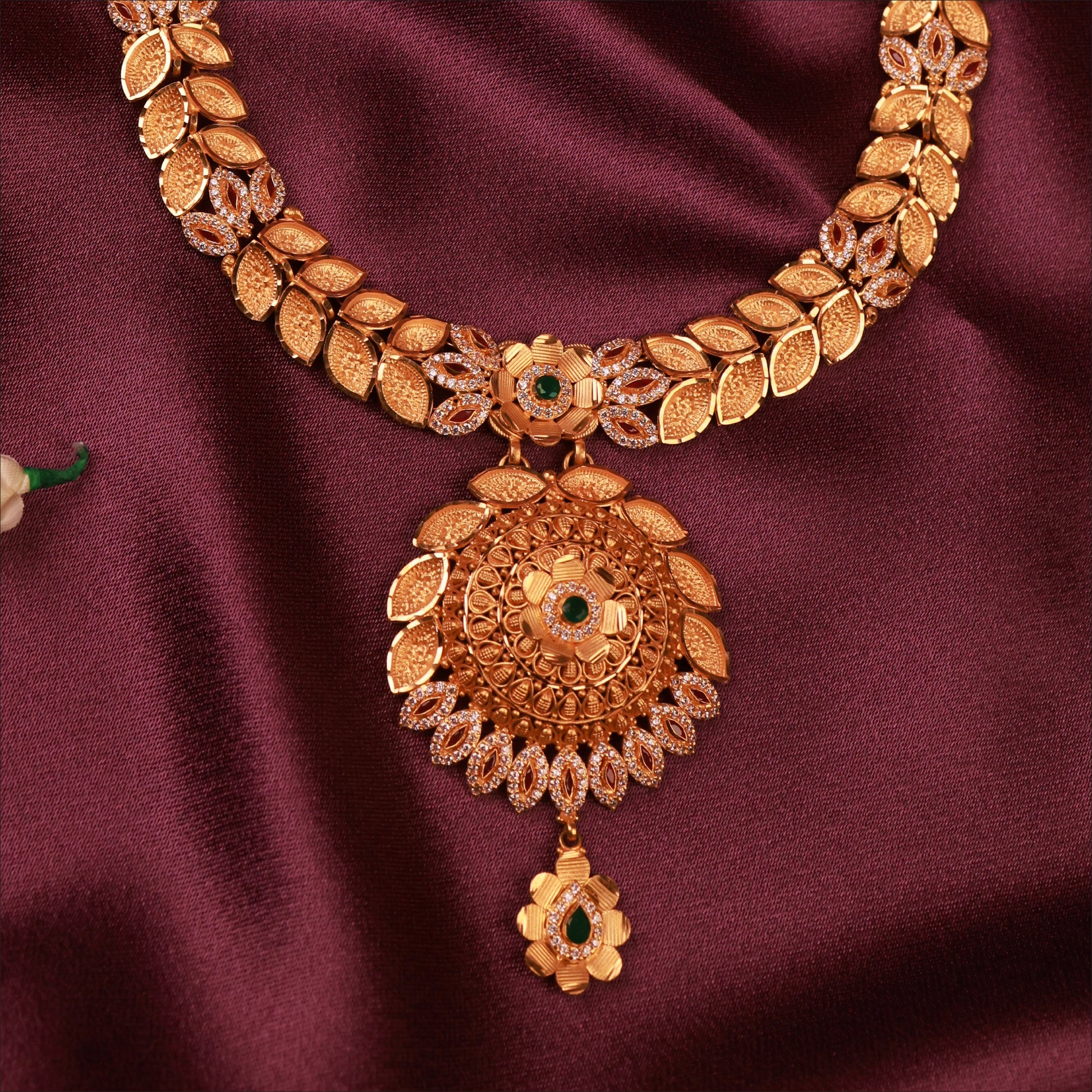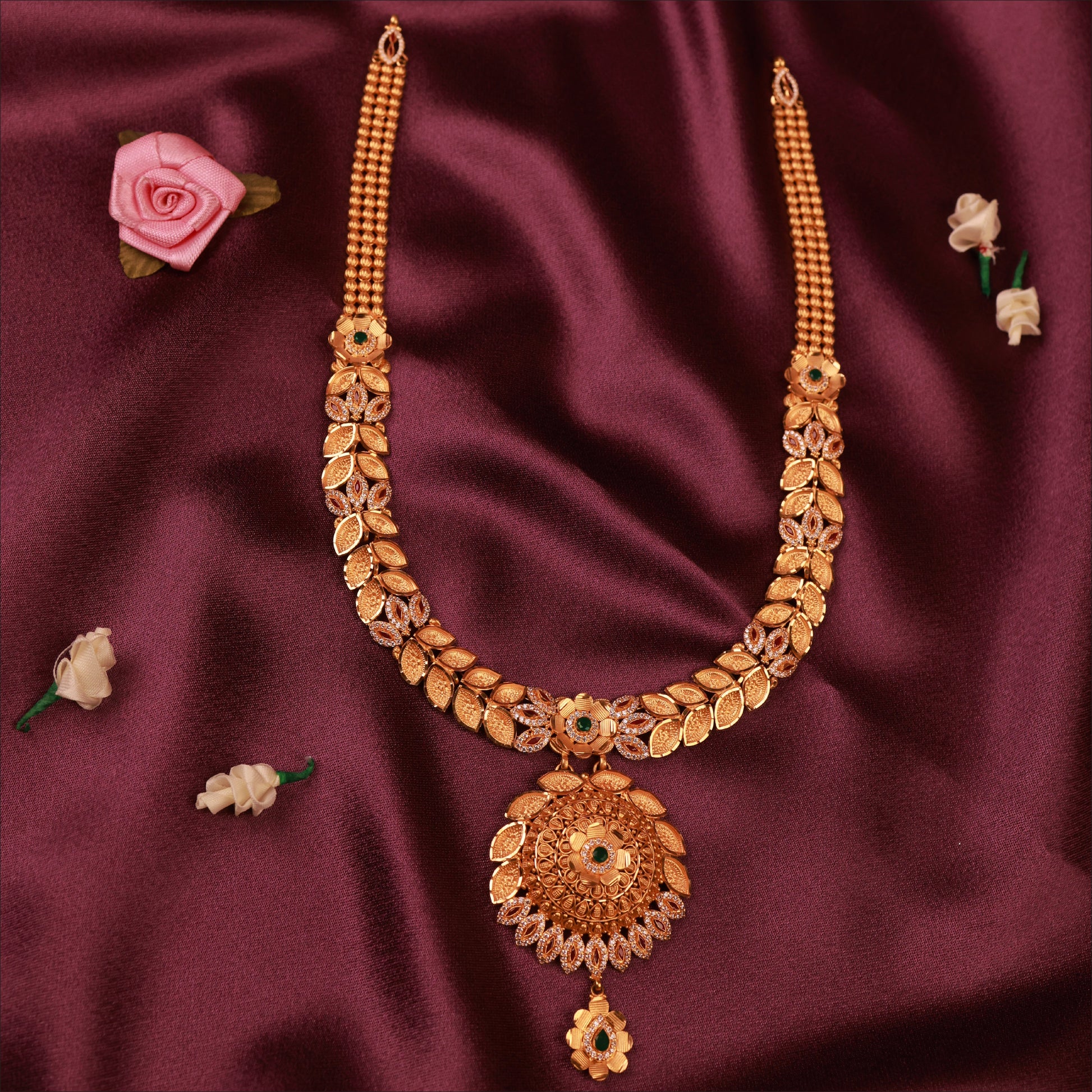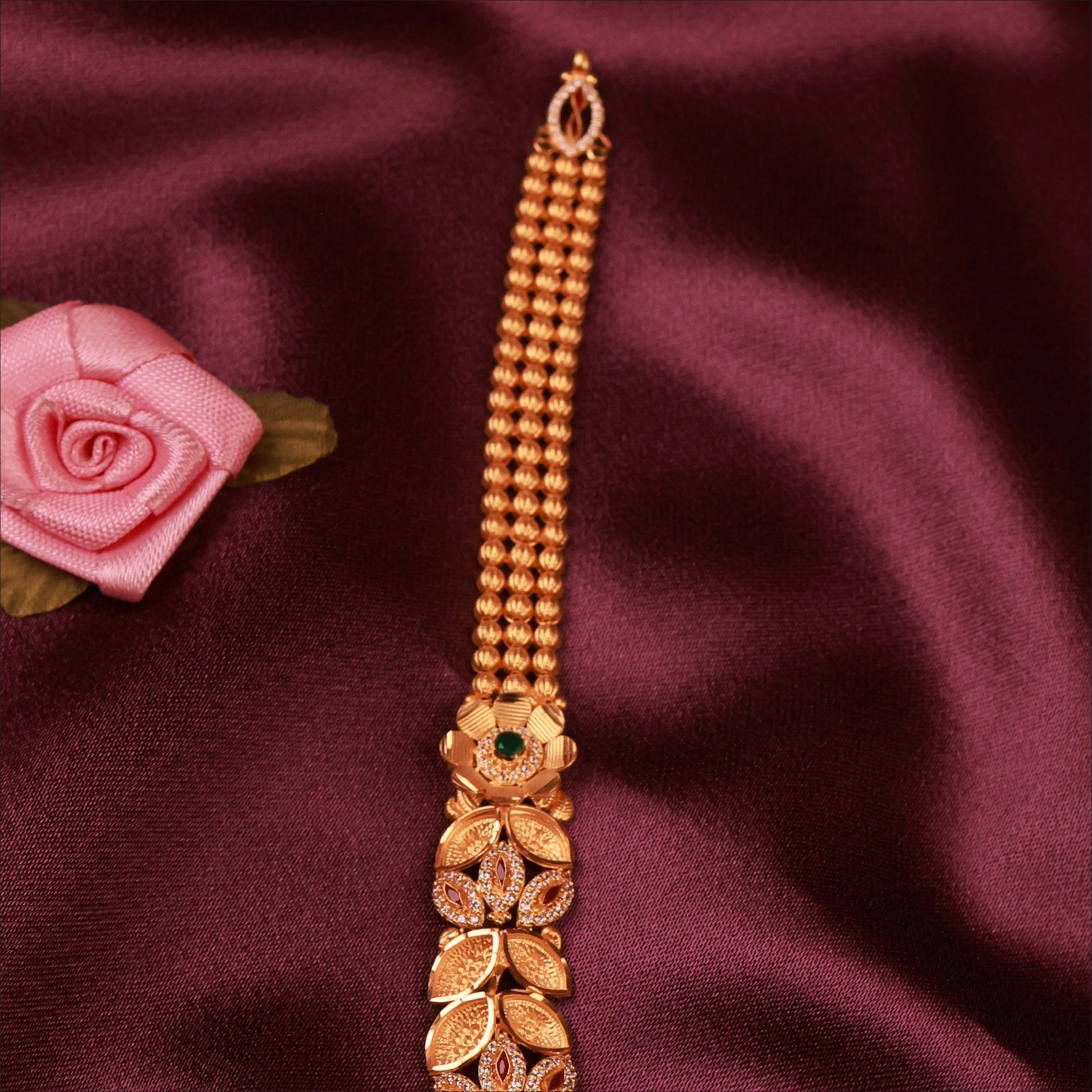 Make a statement with this dazzling Mukthi Haram. Crafted in high-quality 22KT Gold, this piece is a highlight of our Stone collection. Perfect for weddings and festive occasions