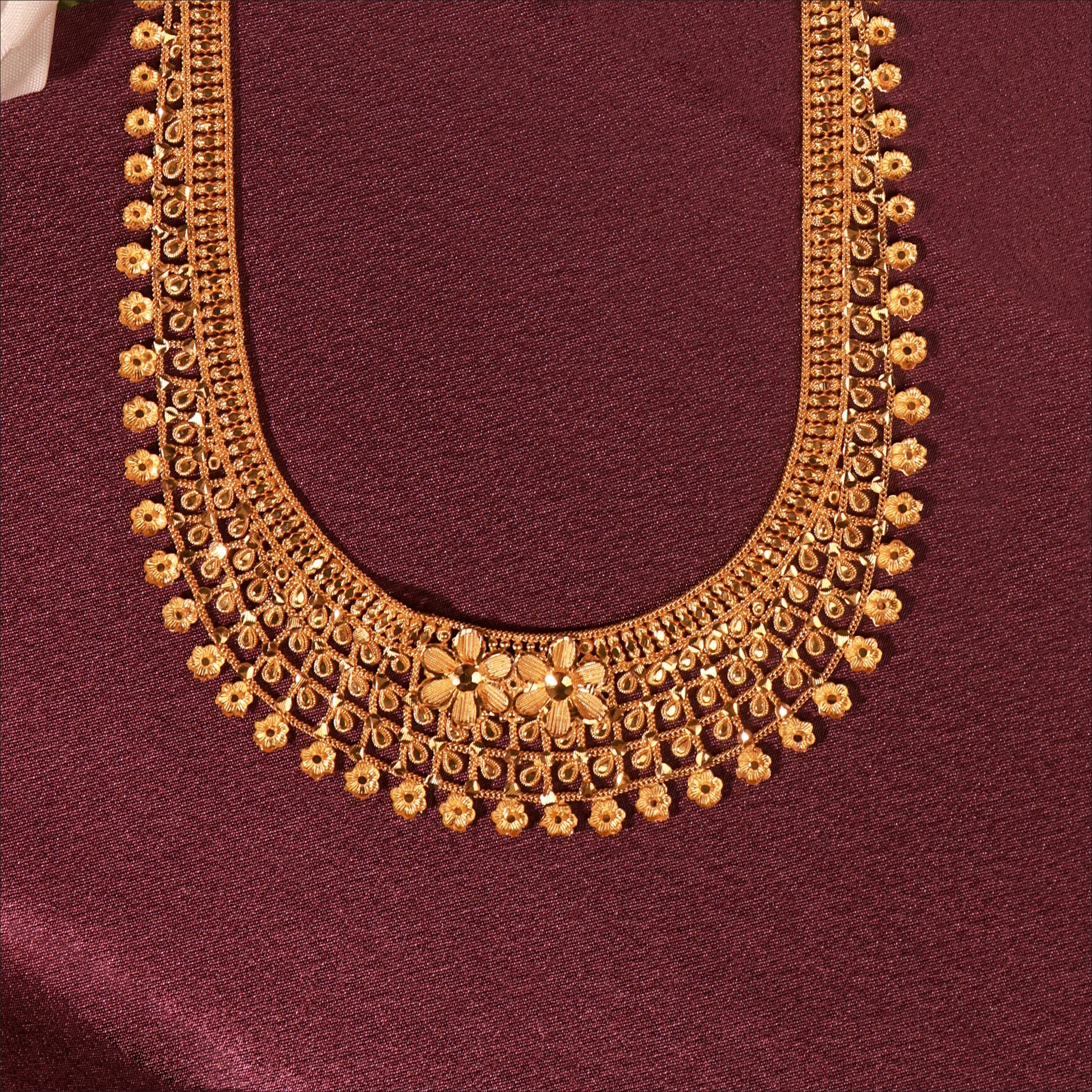 Experience true luxury with this modern Bombay Floral Haram. Crafted in high-quality 22KT Gold, this piece is a highlight of our Fancy collection. Perfect for weddings and festive occasions