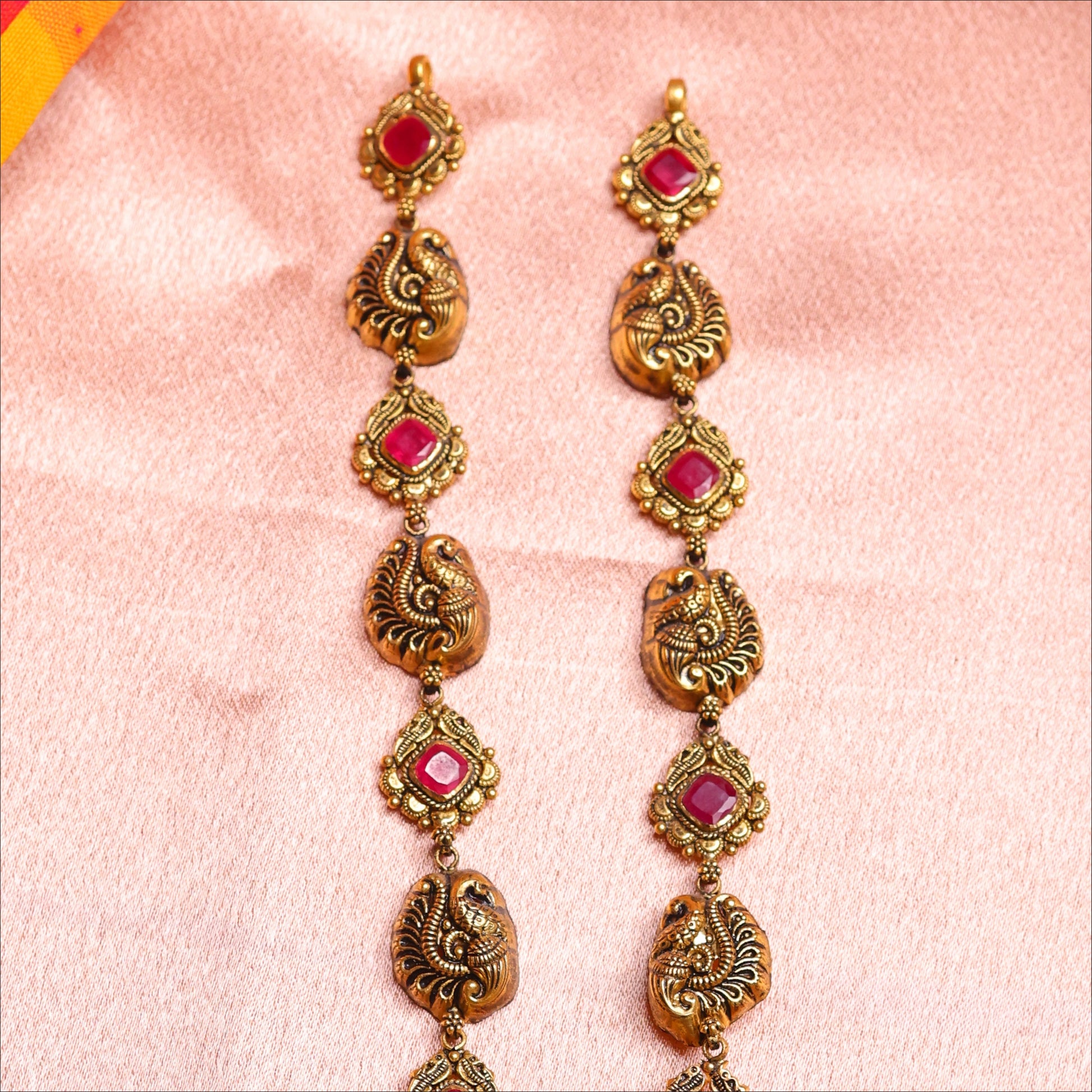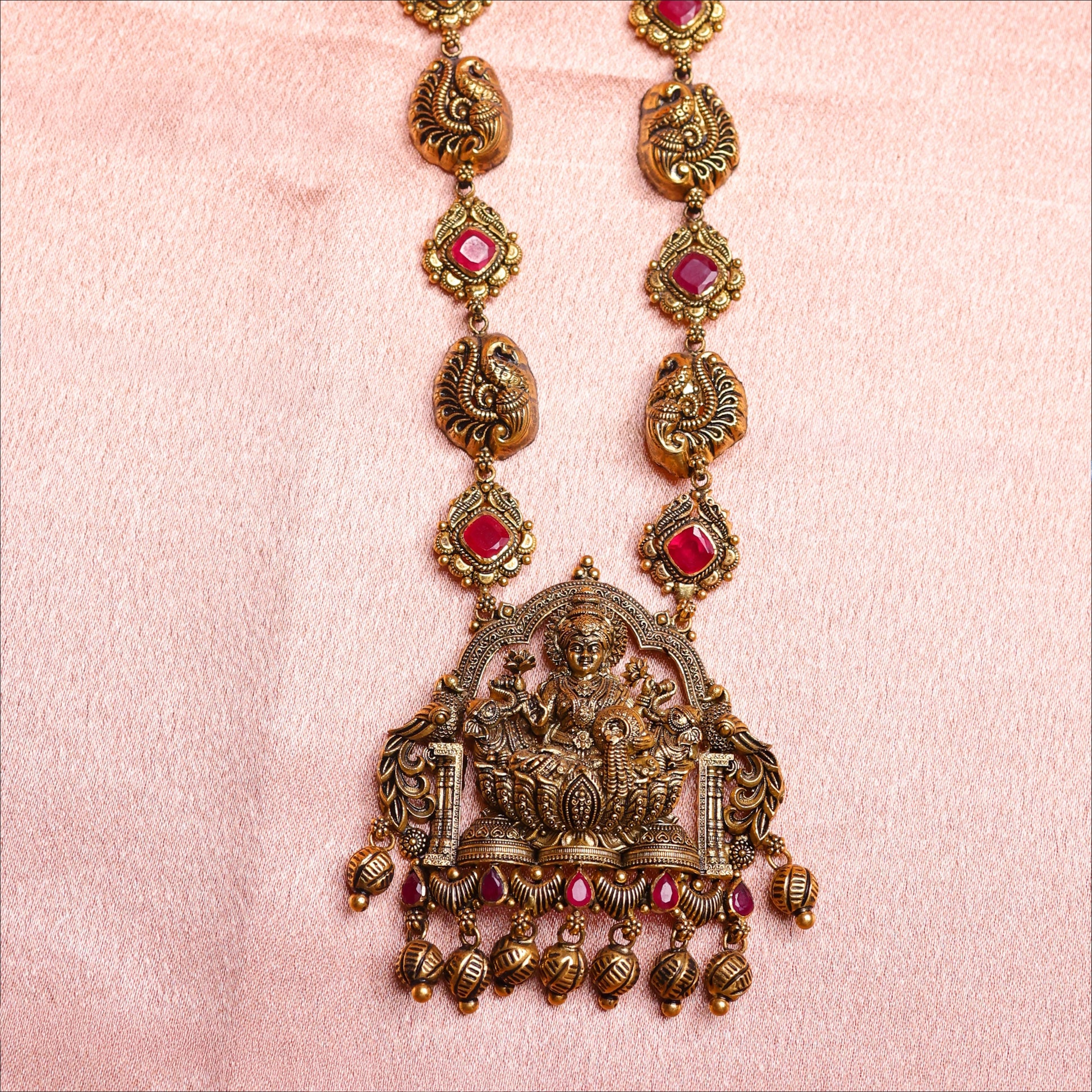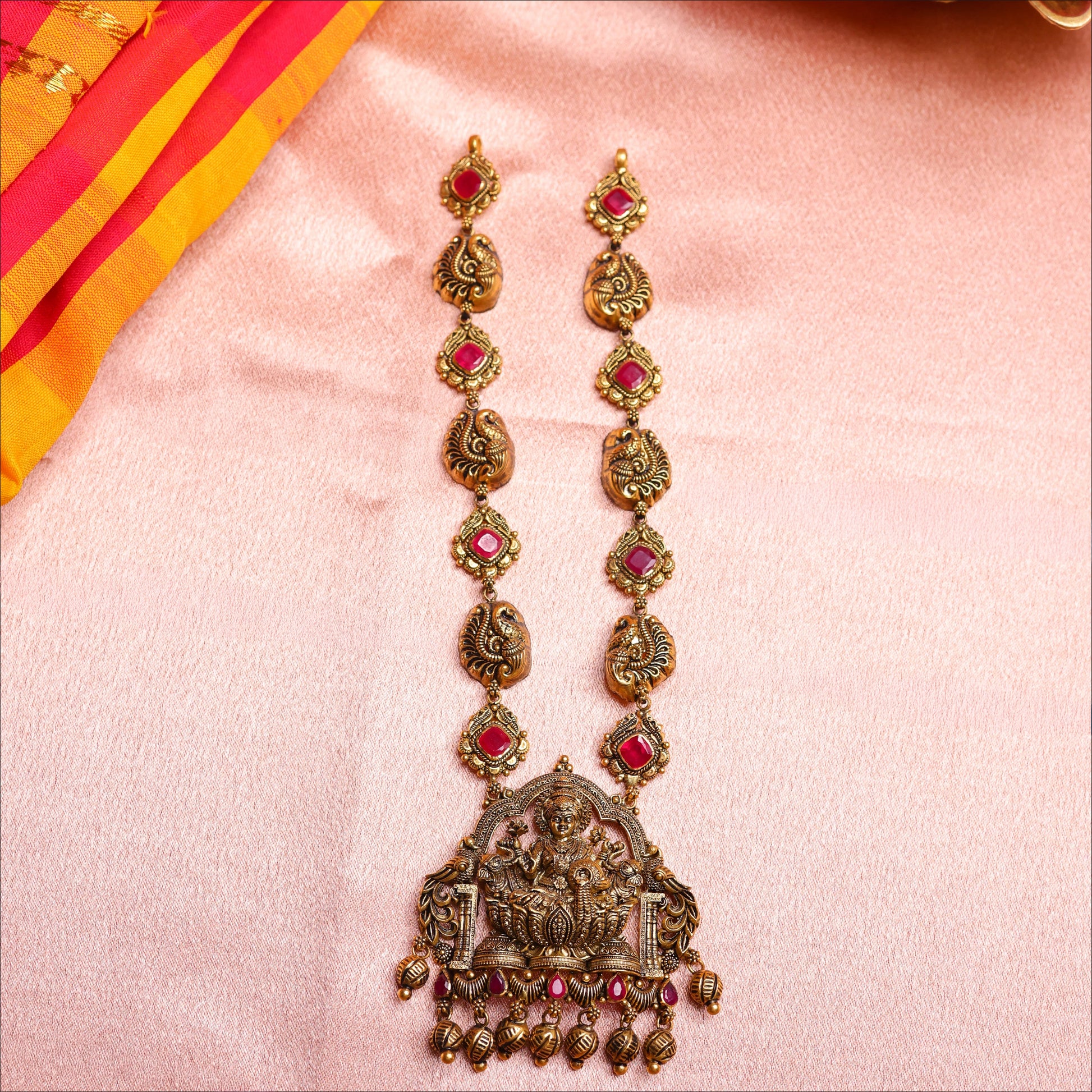 Showcase your devotion with this exquisite 22KT Gold antique necklace. It features a prominent antique Lakshmi pendant, flanked by two regal peacock figures. The entire piece is handset with glittering stones, making it a standout example of traditional temple jewellery.
