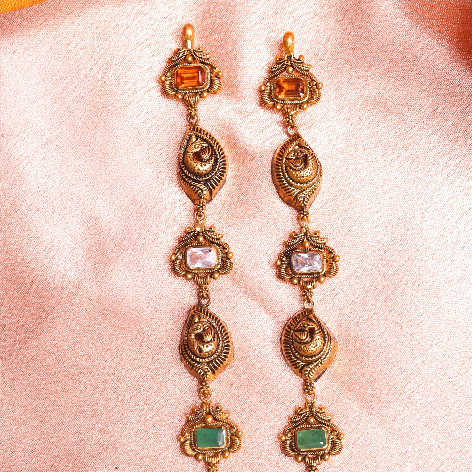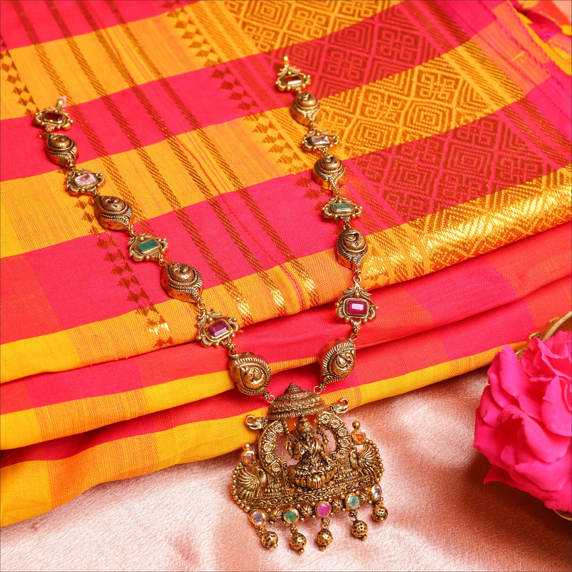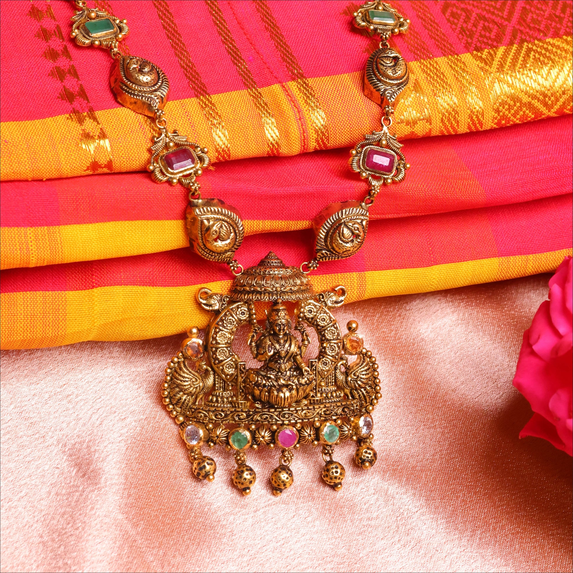Celebrate celestial energy with this sacred 22KT Gold antique necklace. It features a divine Lakshmi seated on a lotus, powerfully surrounded by the sacred nine navarathna stones. This vibrant antique necklace for women is a beautiful expression of faith and timeless style.
