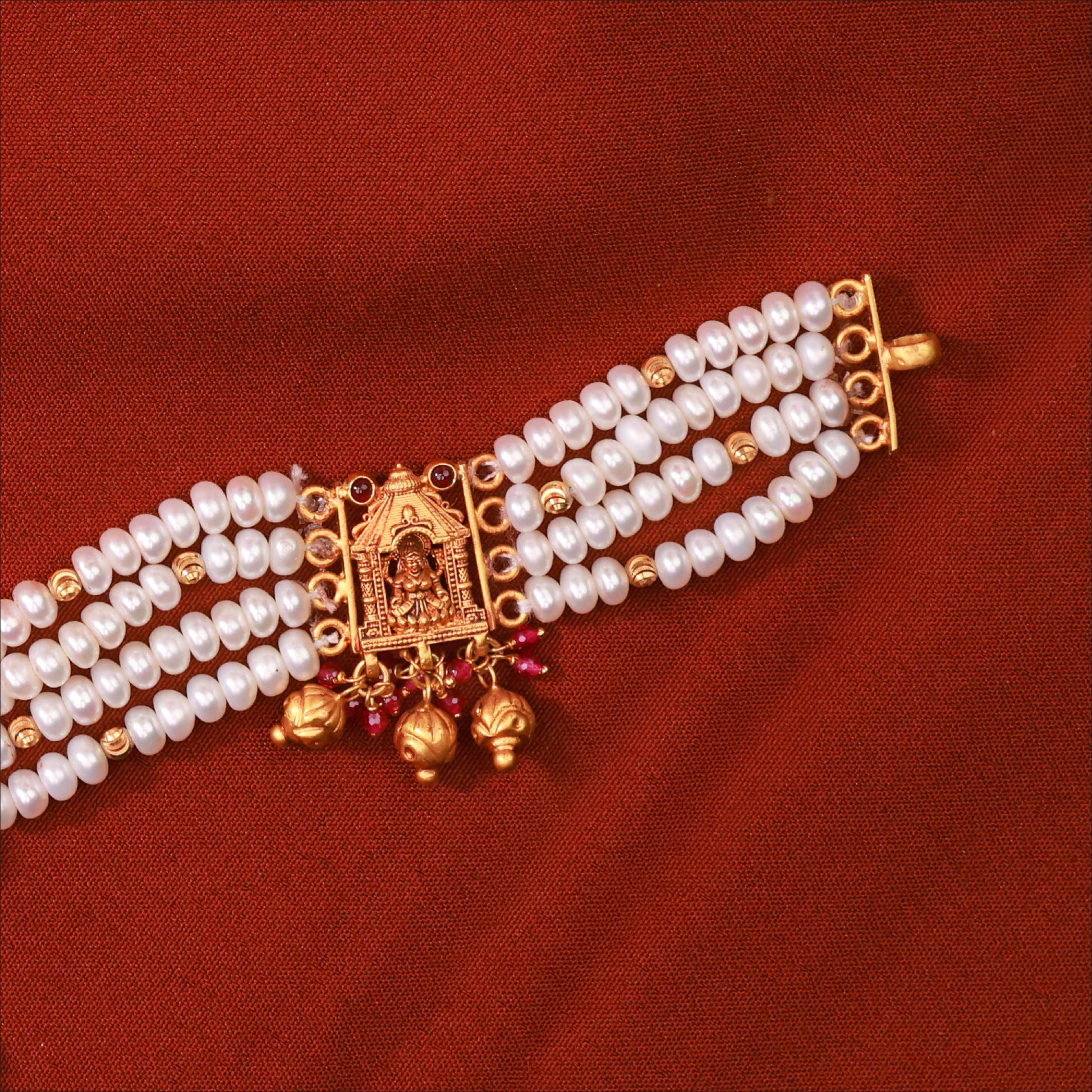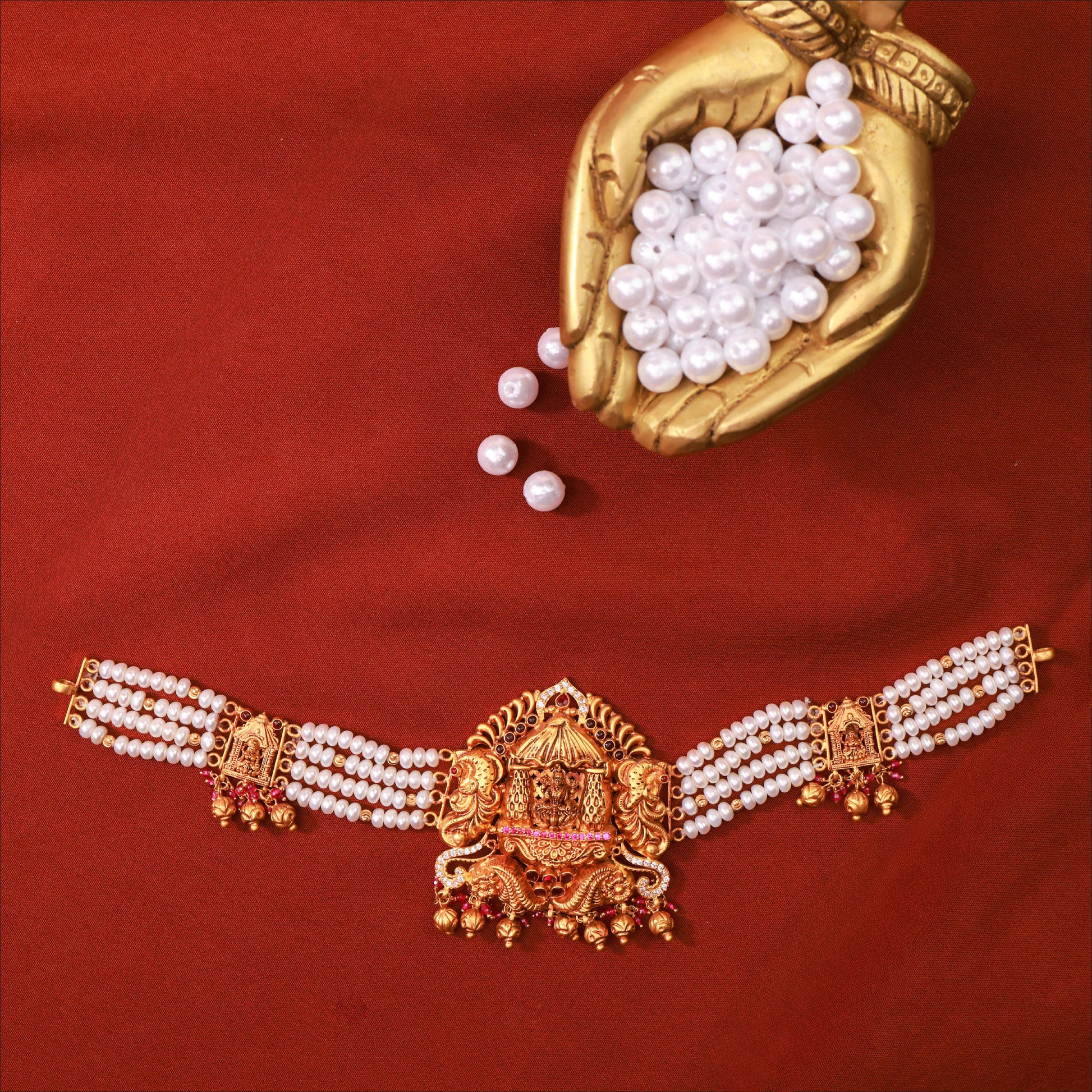 Experience true luxury with this regal Chariot Lakshmi With Pearls Necklace. Crafted in high-quality 22KT Gold, this piece is a highlight of our Antique collection. Perfect for weddings and festive occasions.