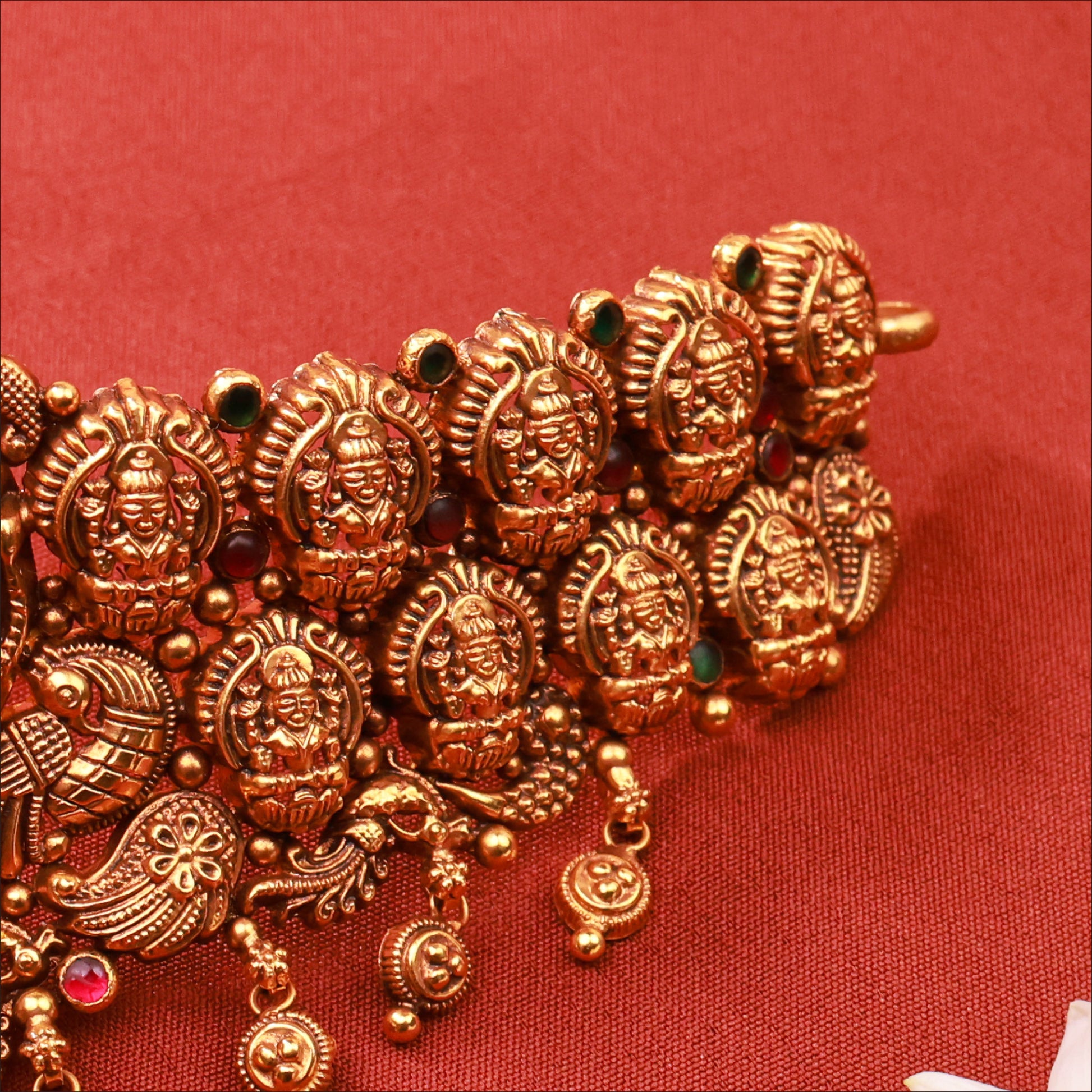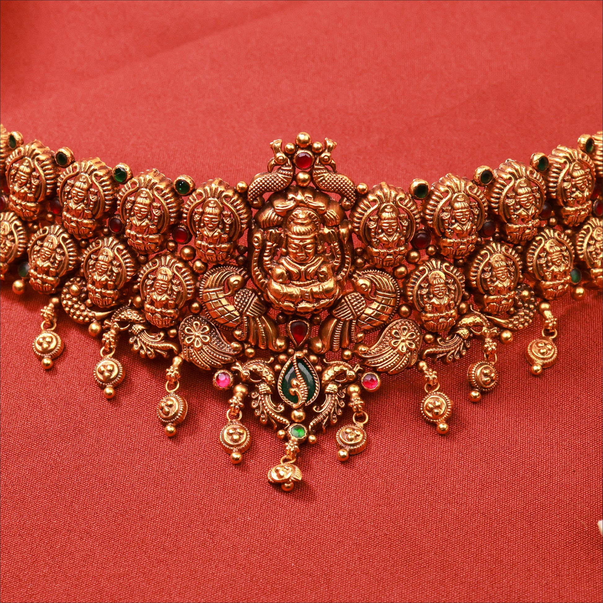 Elevate your look with this vintage-inspired Antique Lakshmi Choker. Crafted in high-quality 22KT Gold, this piece is a highlight of our Antique collection. Perfect for weddings and festive occasions.