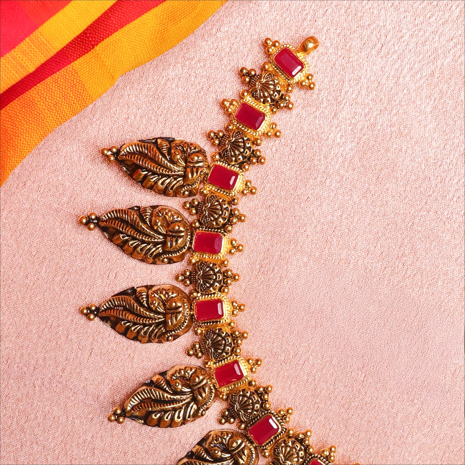 Capture a look of royal heritage with this 22KT Gold antique necklace. The chain is adorned with radiant ruby stones and a delicate leaf design, all leading to a magnificent antique Lakshmi pendant. This stunning necklace for women is a perfect blend of colour and tradition