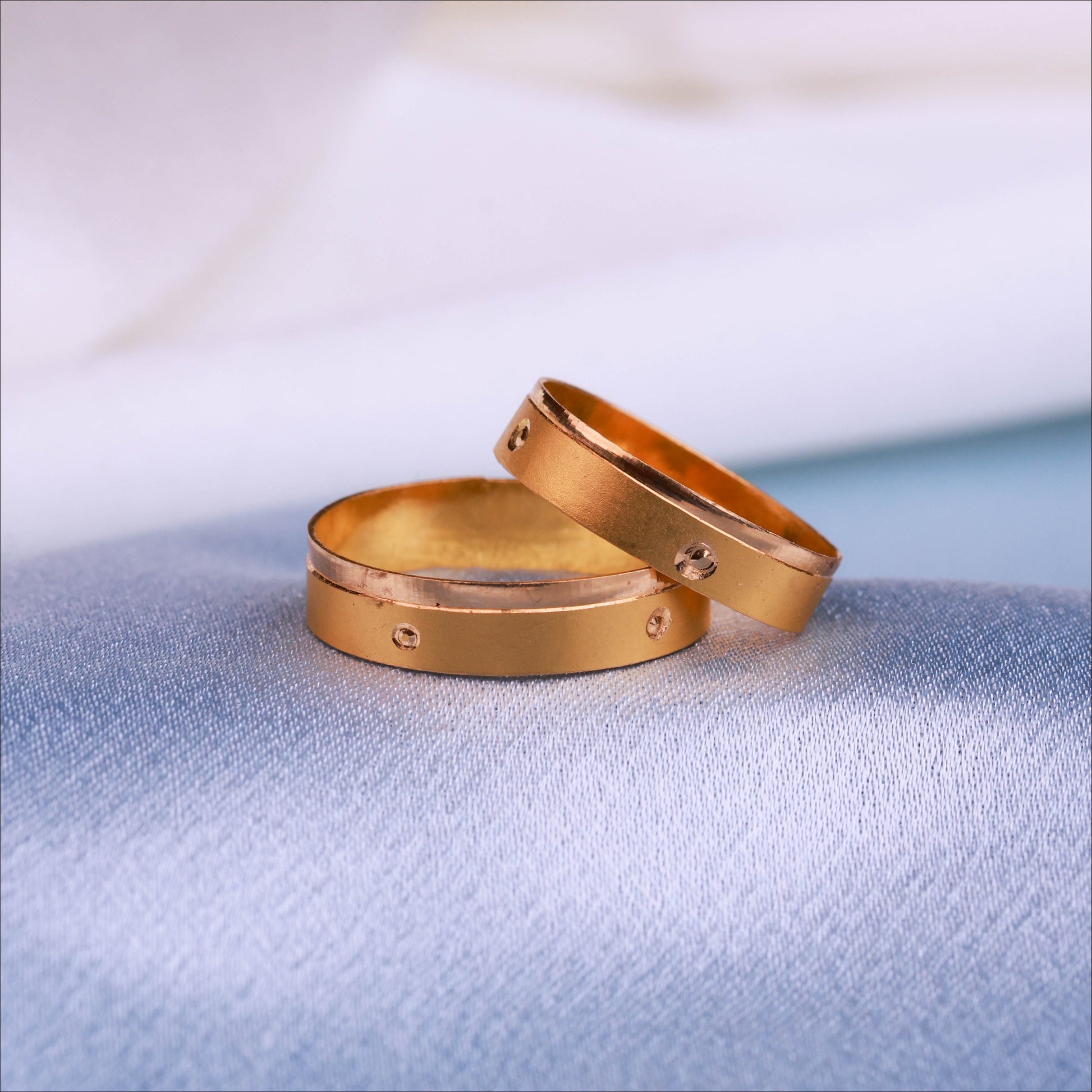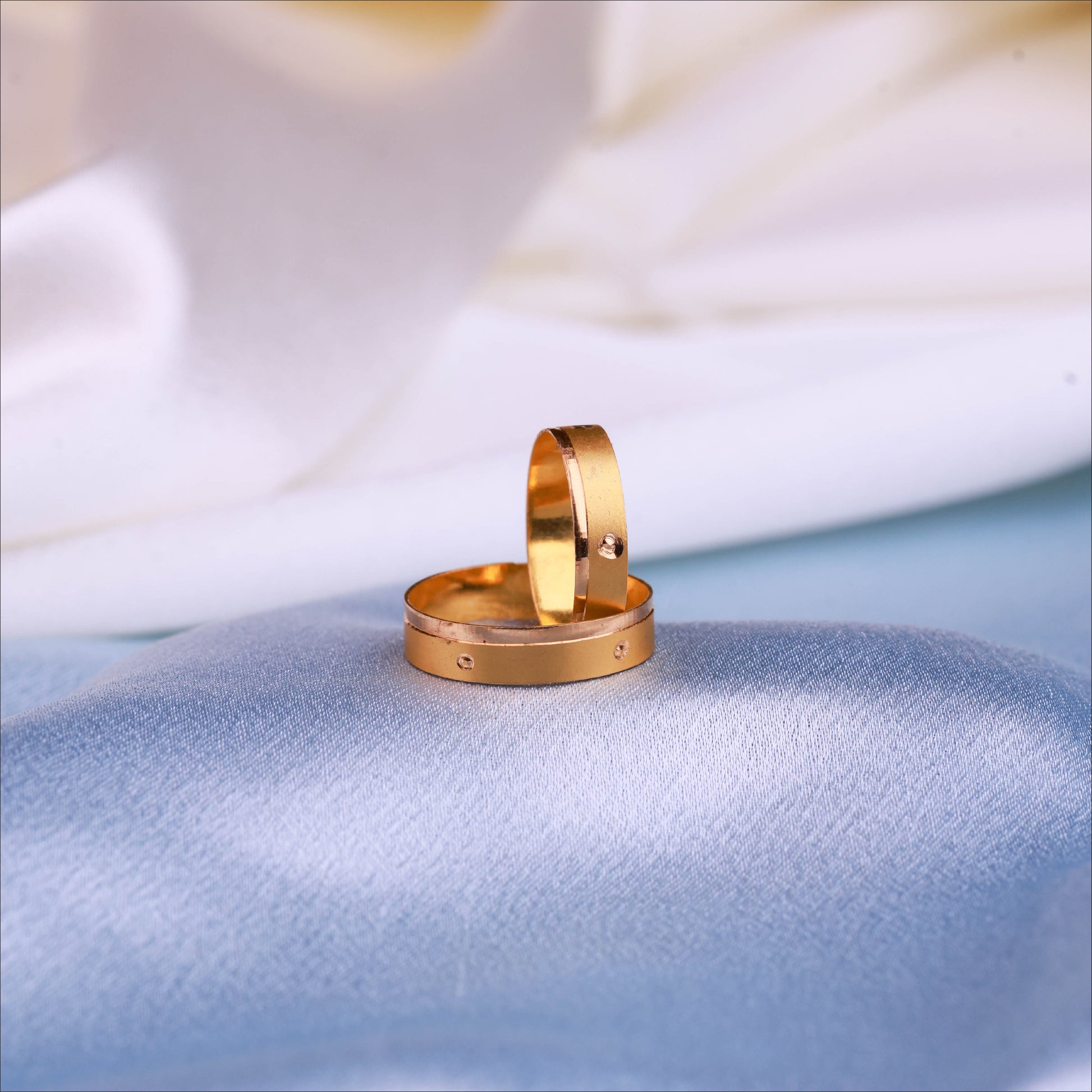 Celebrate a love that is bright and bold. This stunning 22KT gold Malabar cutting ring set is designed for maximum brilliance, with intricate facets that sparkle dazzlingly. The design is further enhanced with a modern, two-tone rhodium finish, creating a striking contrast. These designer couple's rings are a perfect symbol of a vibrant, shining partnership."