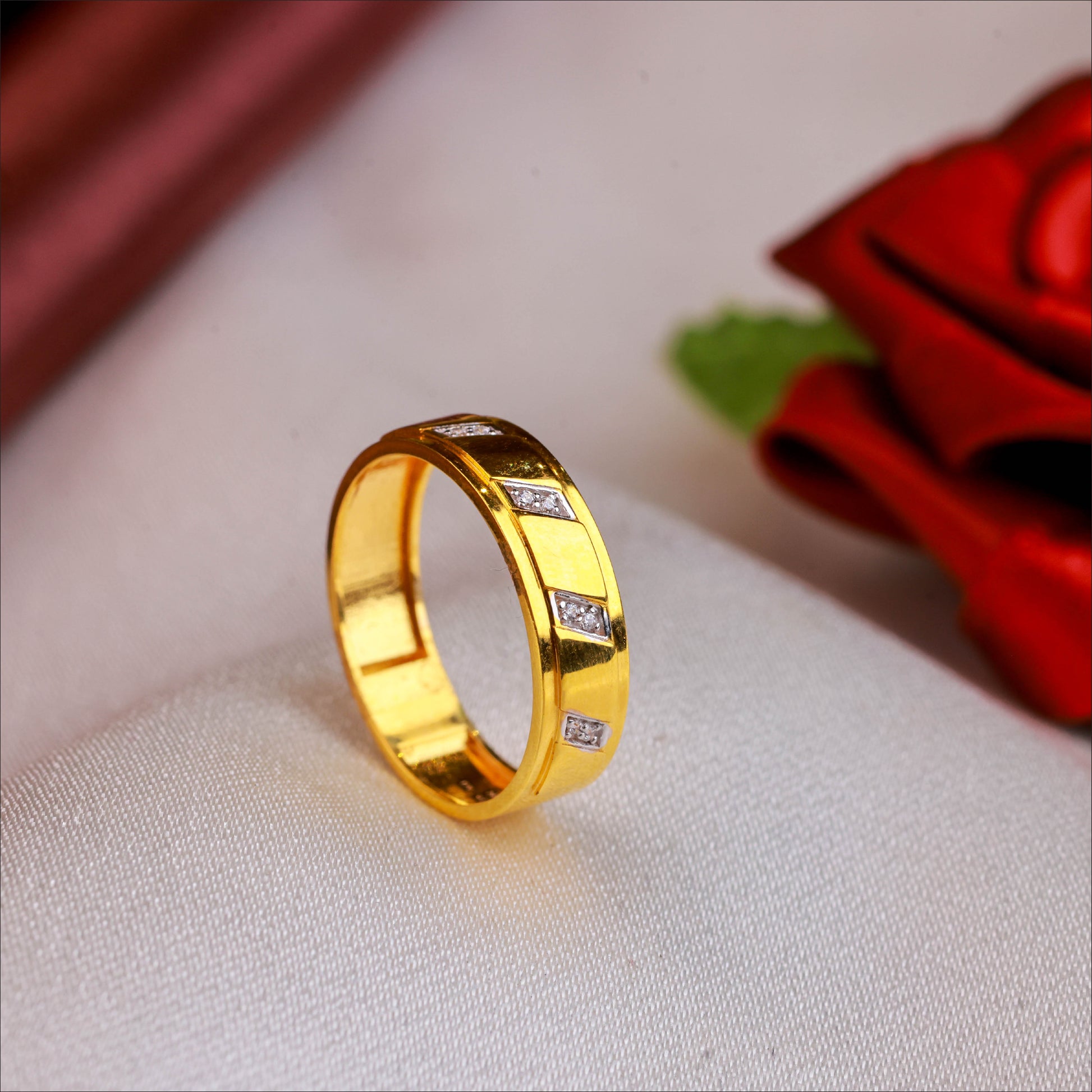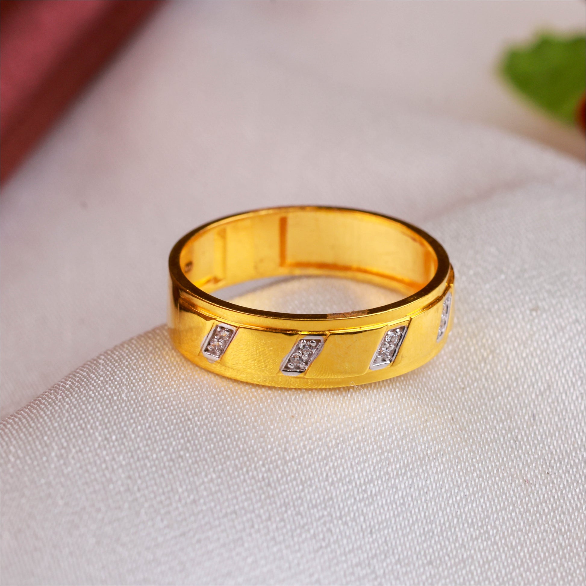 Experience the perfect blend of brilliance and bold design with this 22KT gold Malabar casting ring for men. This handsome ring features the intricate, light-catching facets of Malabar cutting, enhanced with the sparkling fire of CZ stones. It's a statement of modern masculinity and refined taste."