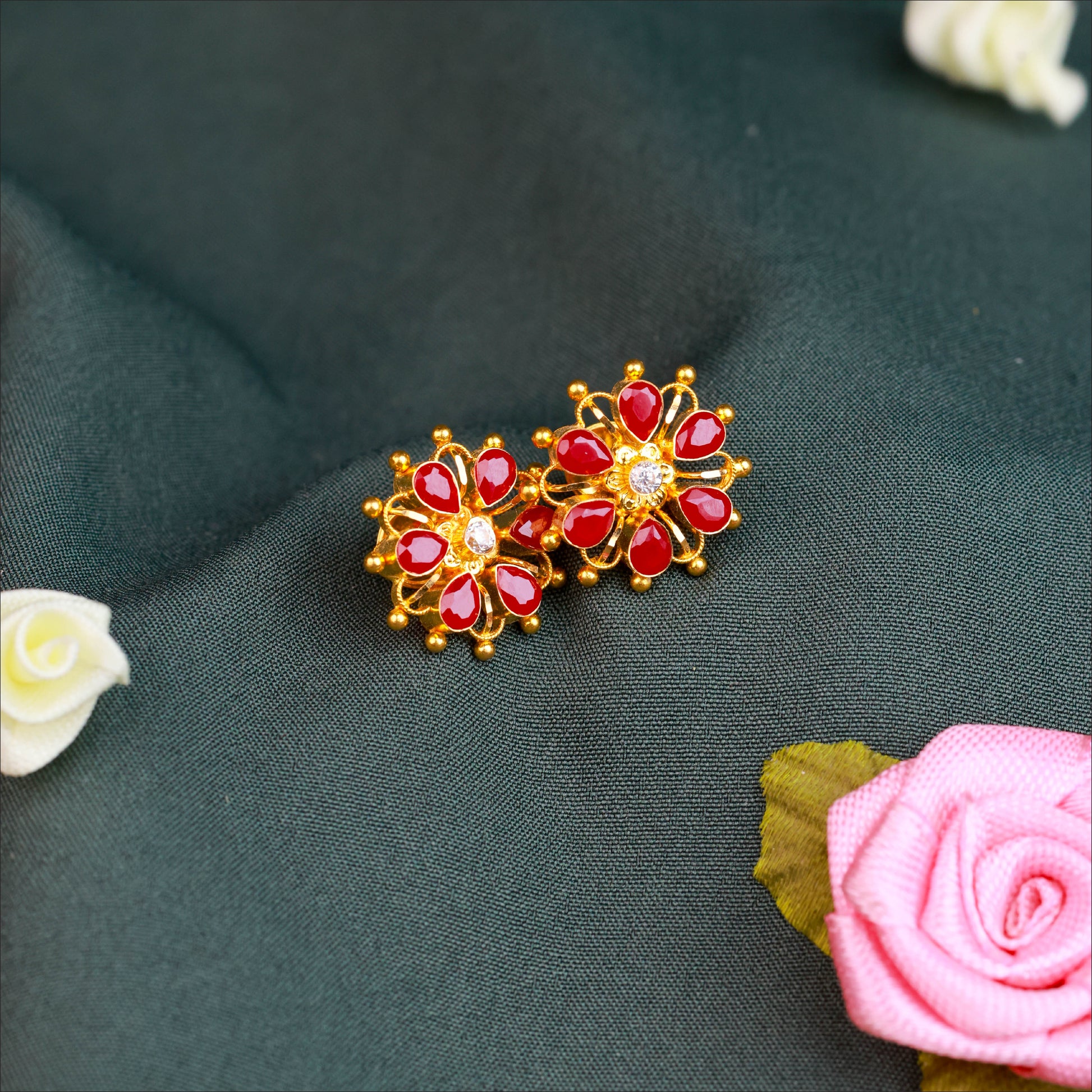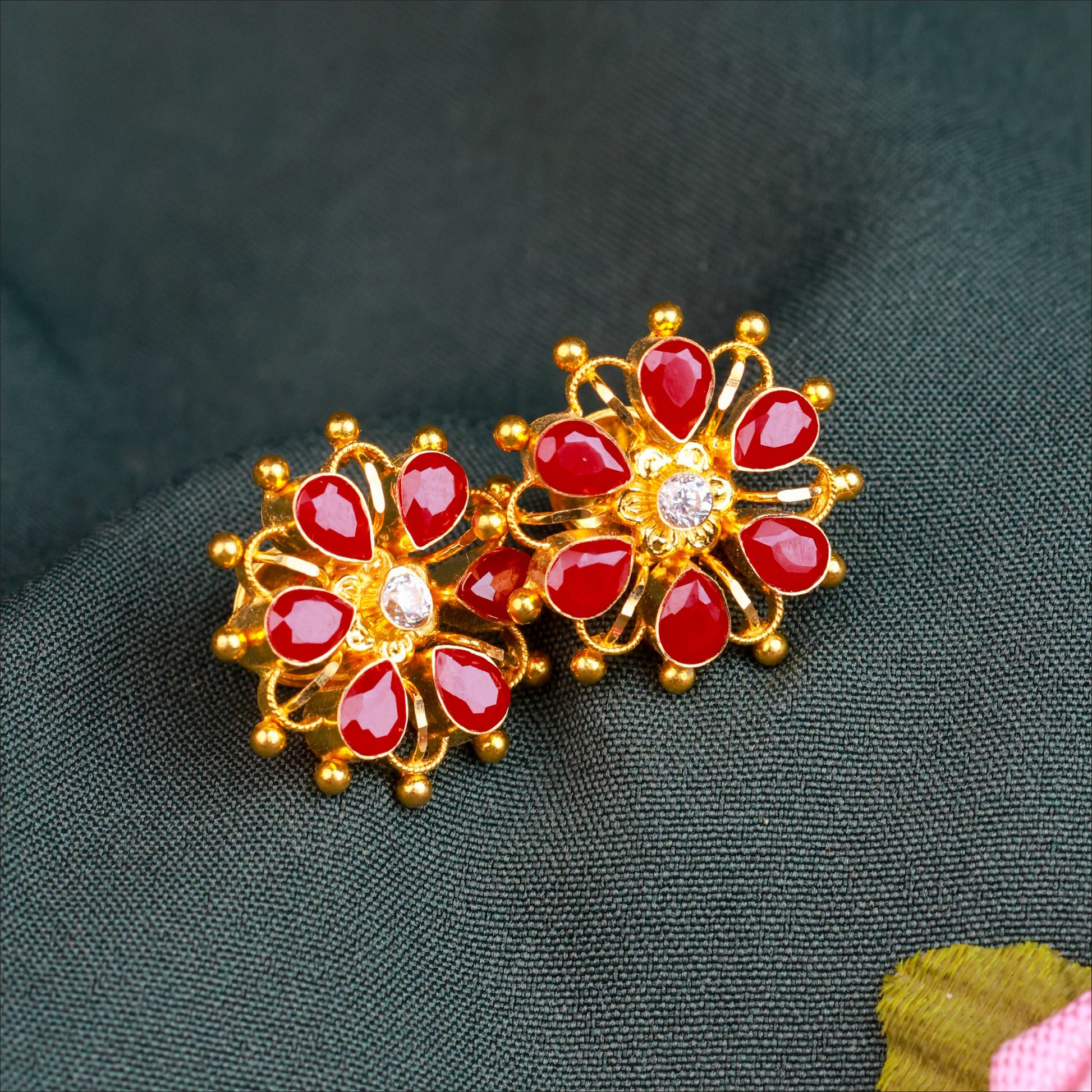 Radiate elegance with these glamorous Ruby Fancy Stud. Crafted in high-quality 22KT Gold, this pair is a standout in our Stone & Pearl Collection. Perfect for daily wear