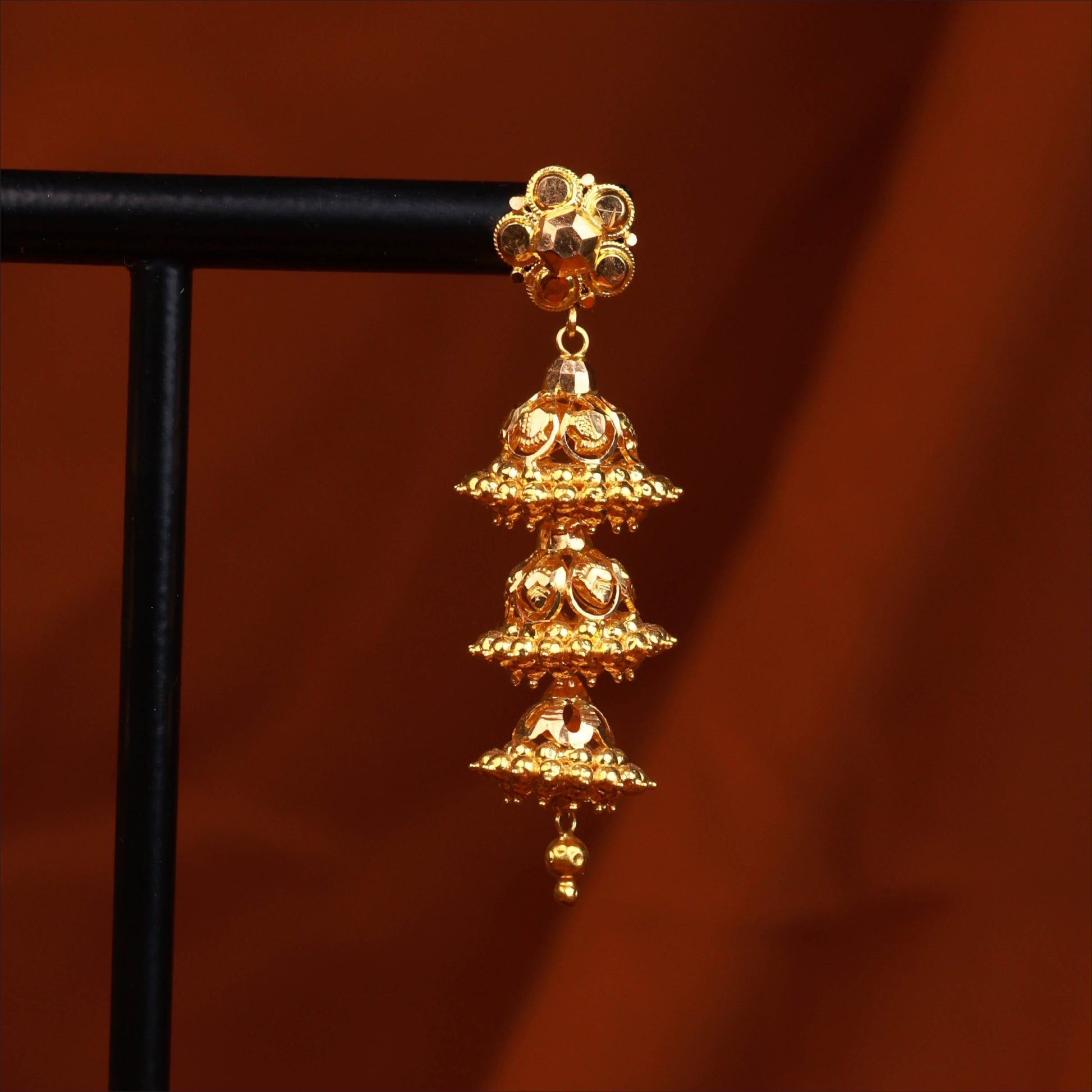 Grace your ears with these graceful Triple Layer Long Drops. Crafted in high-quality 22KT Gold, this pair is a standout in our Jhumka Collection. Perfect for weddings and festive occasions